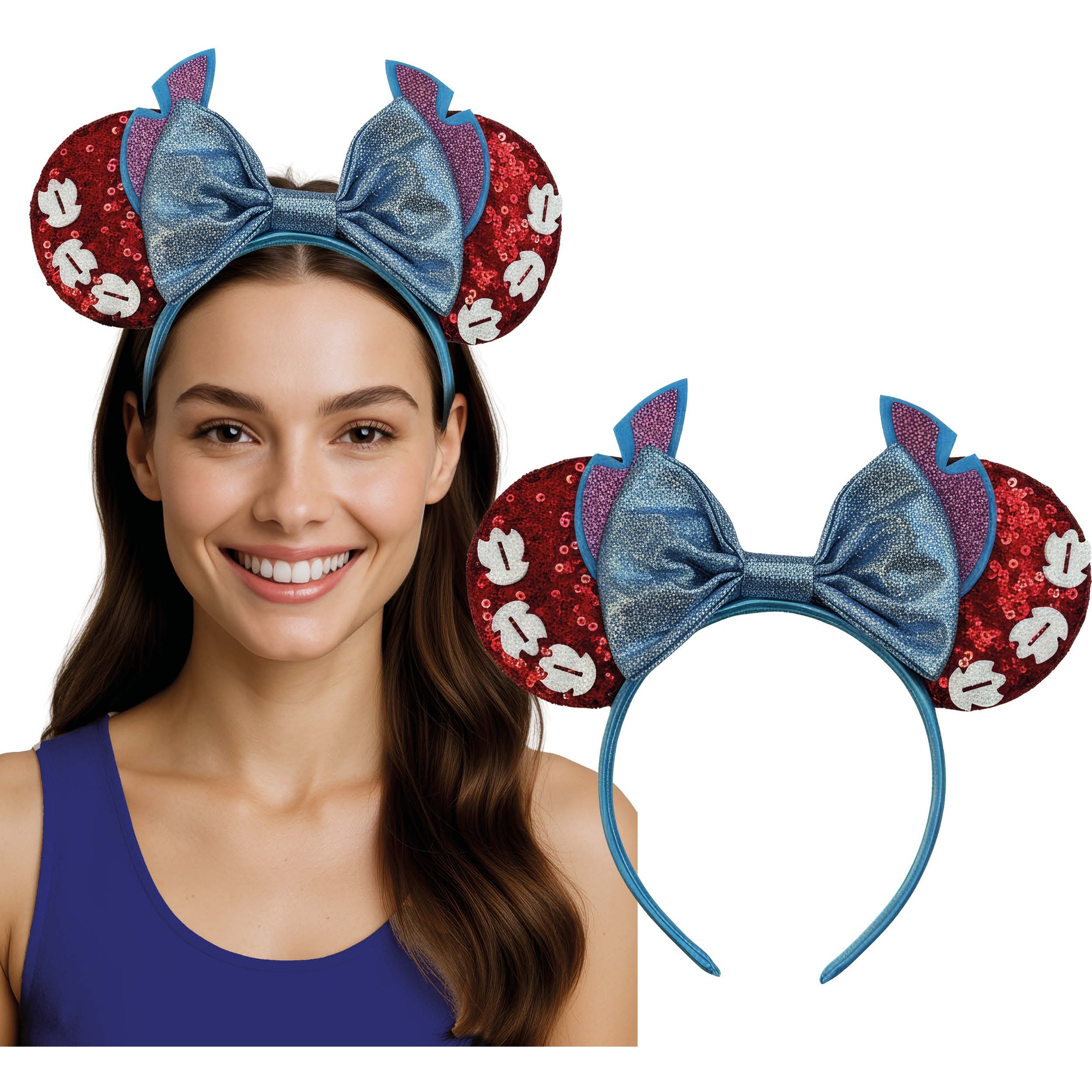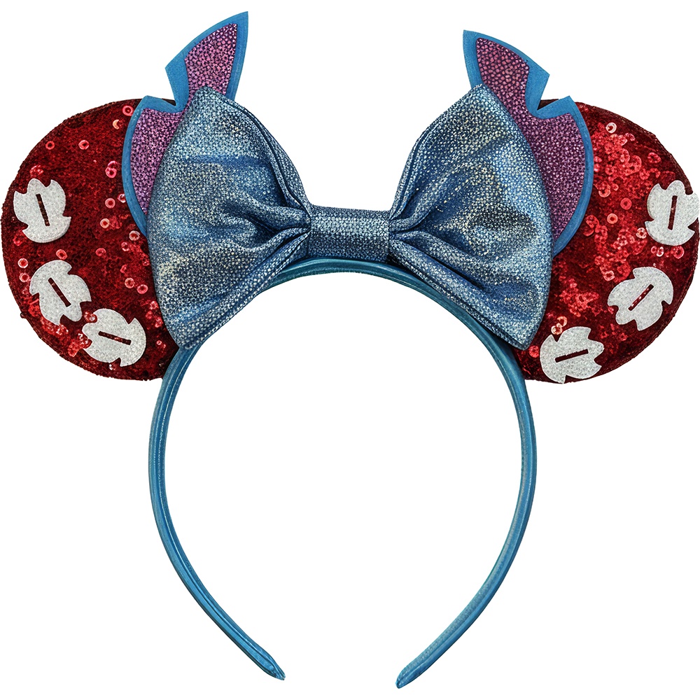Diadema azul con orejas redondas y un gran lazo brillante inspirada en Minnie.