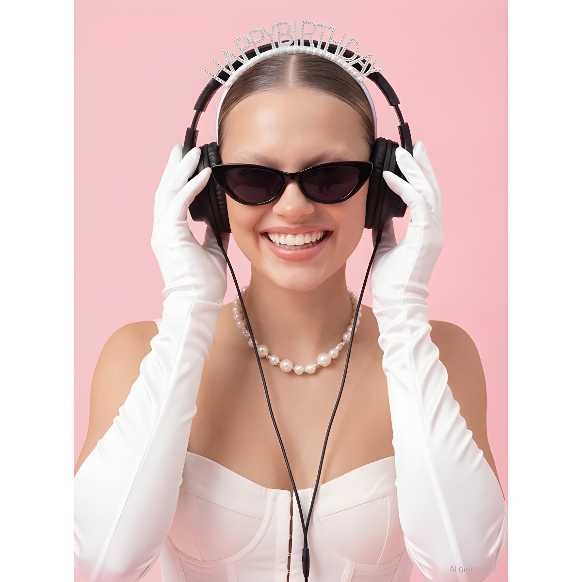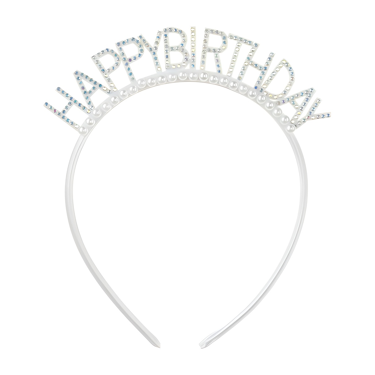 Diadema festiva con la inscripción "Happy Birthday" en acabado plateado, adornada con perlas decorativas y detalles brillantes.