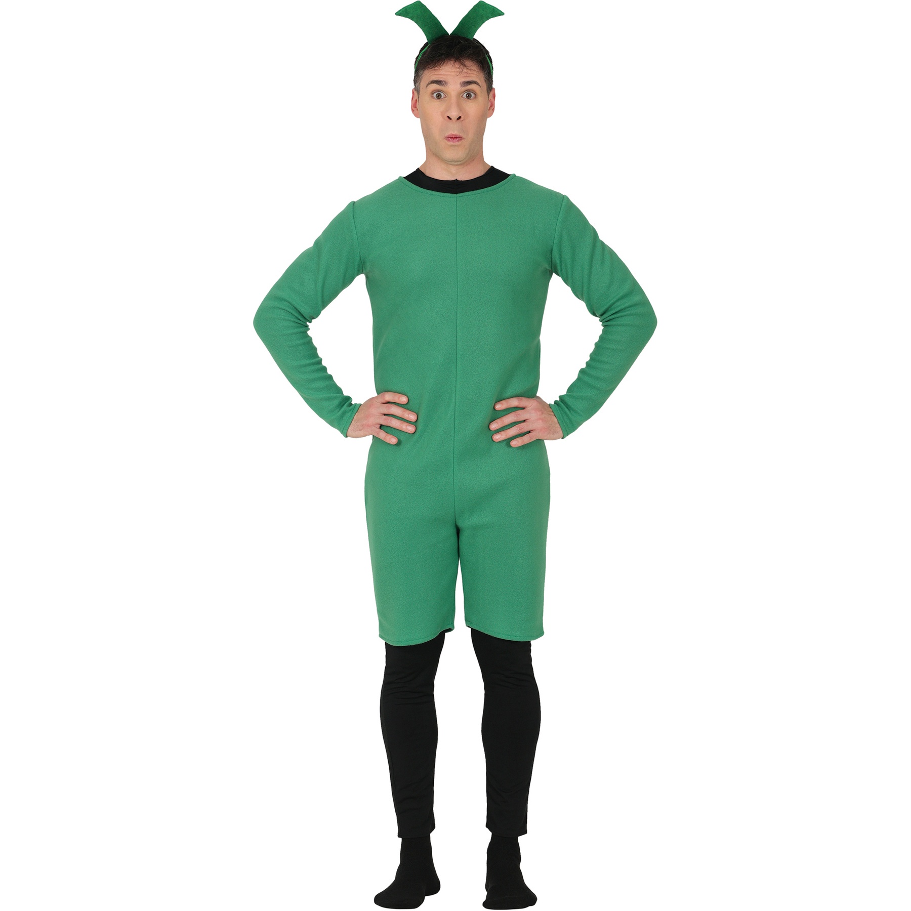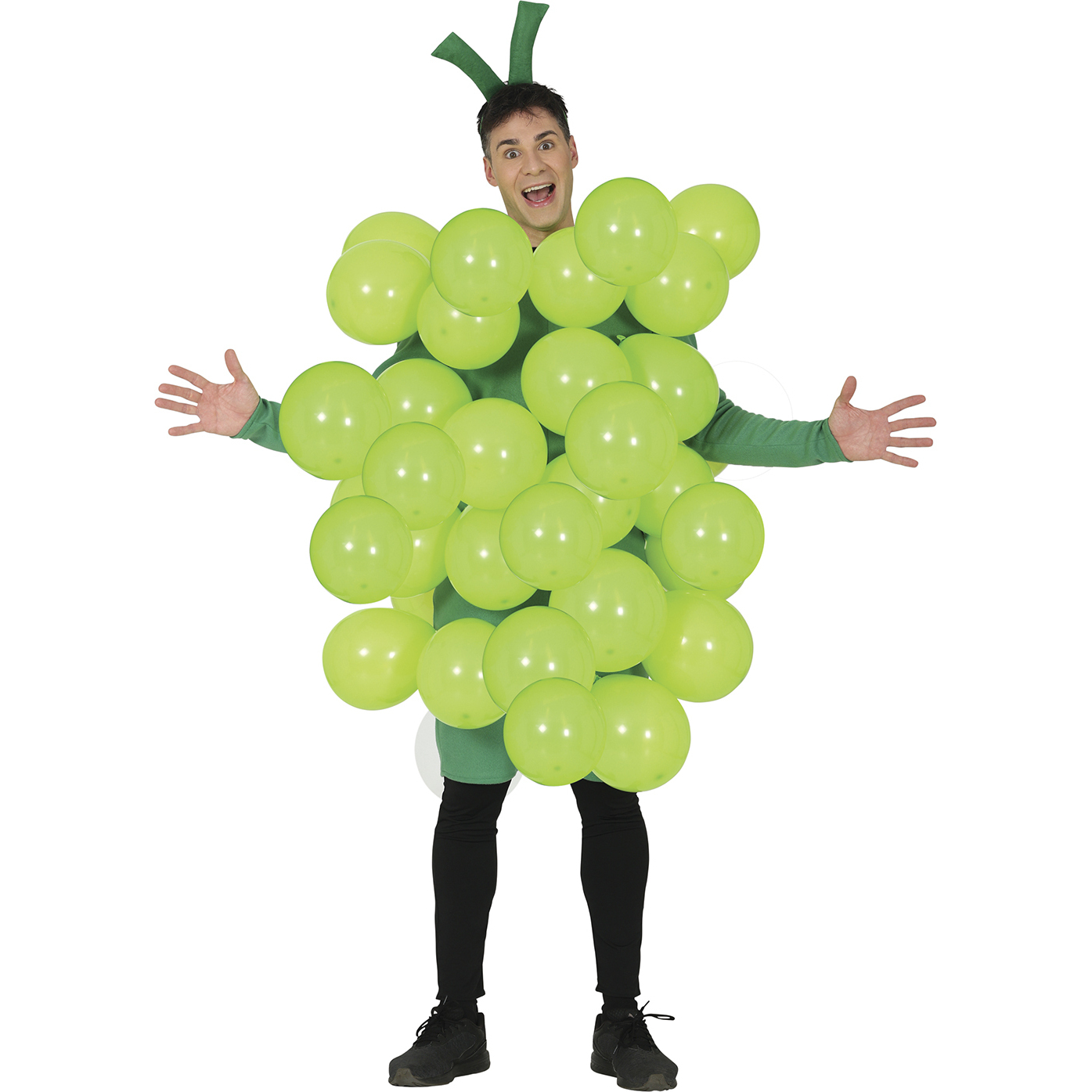 Divertido disfraz que consiste en un mono verde que añadirás los globos incluidos pegados con los adhesivos incluidos, así te convertirás en una uva verde súper divertida y original.