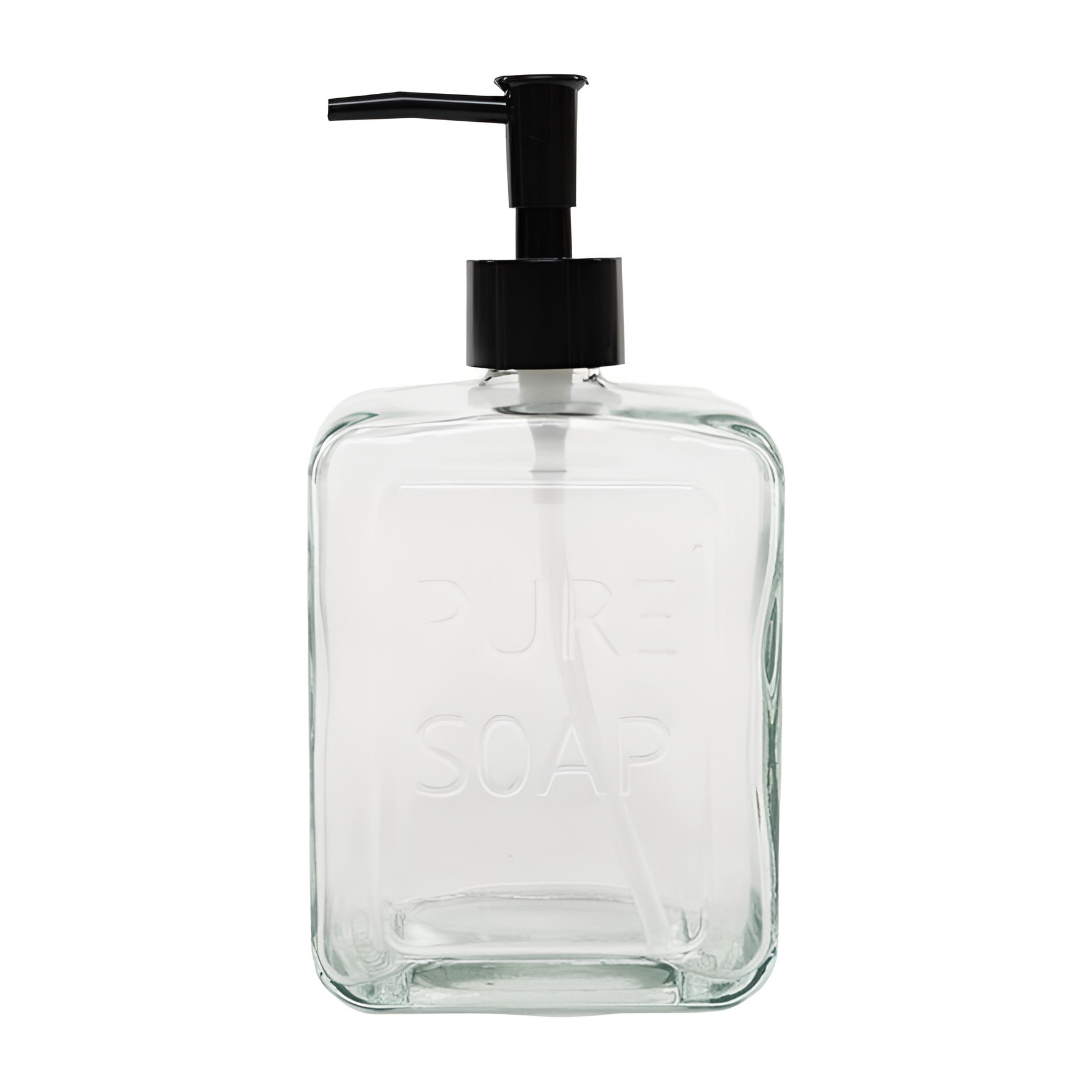Elegante dispensador de jabón con relieve "PURE SOAP" que aporta un toque atemporal y decorativo al baño.