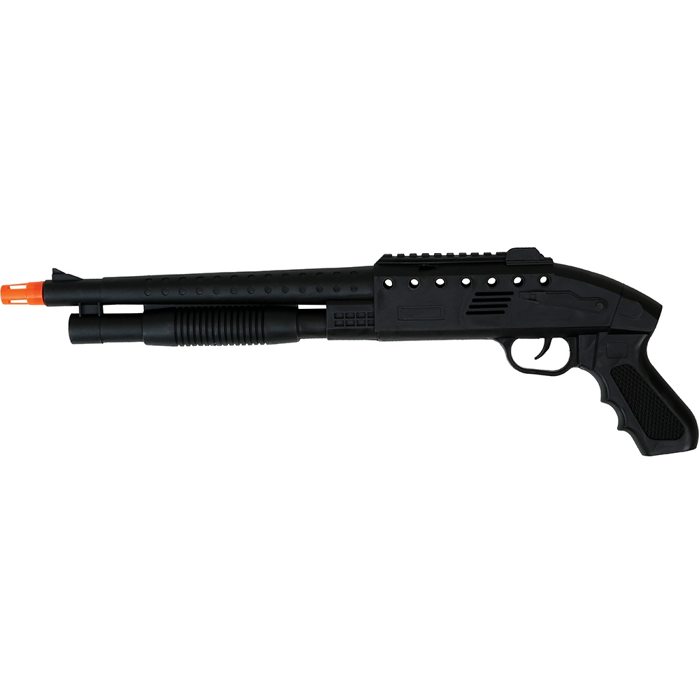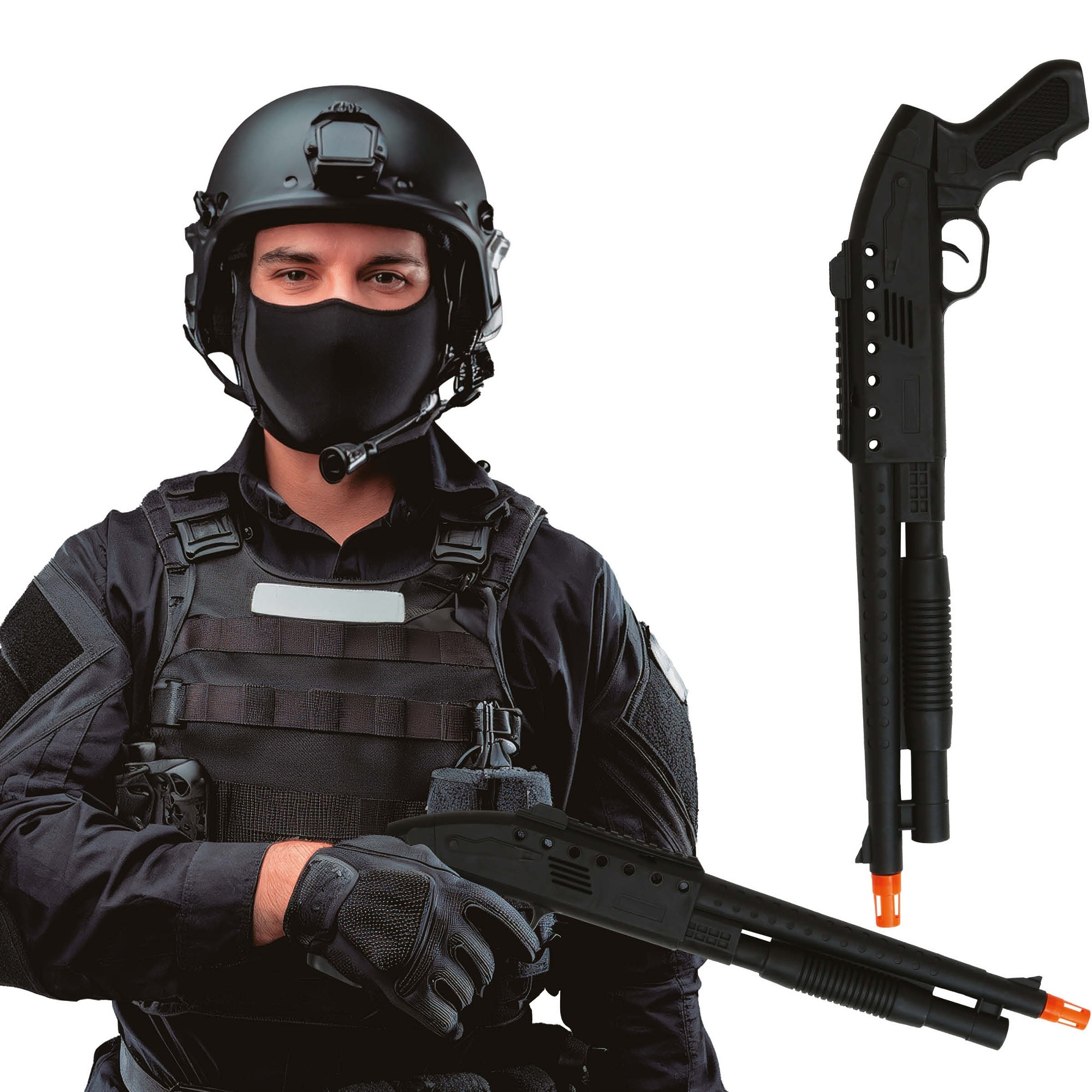 Escopeta de juguete estilo SWAT pensada para completar disfraces y acompañar juegos de rol infantiles. Presenta un diseño realista en negro con punta naranja de seguridad que la identifica como juguete. Ligera y fácil de manejar, resulta ideal para disfraces de policía, fuerzas especiales o actividades temáticas en fiestas. Fabricada en PVC resistente y con una longitud aproximada de 46 cm, está pensada para uso lúdico en Carnaval y celebraciones similares.