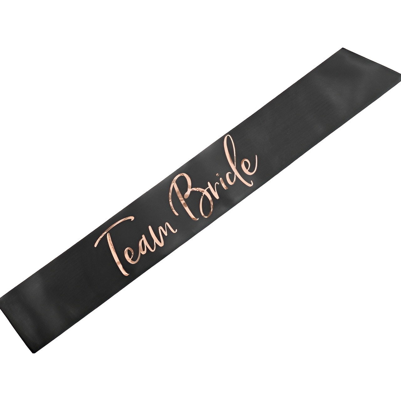 Team Bride en satén negro con elegante impresión en oro rosa que aporta un toque sofisticado y festivo. Mide aproximadamente 75 cm de largo y 10 cm de ancho, con un acabado brillante y una tipografía estilizada que destaca en fotos y celebraciones.