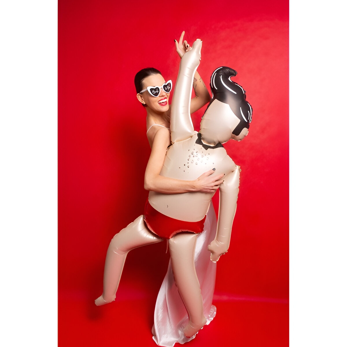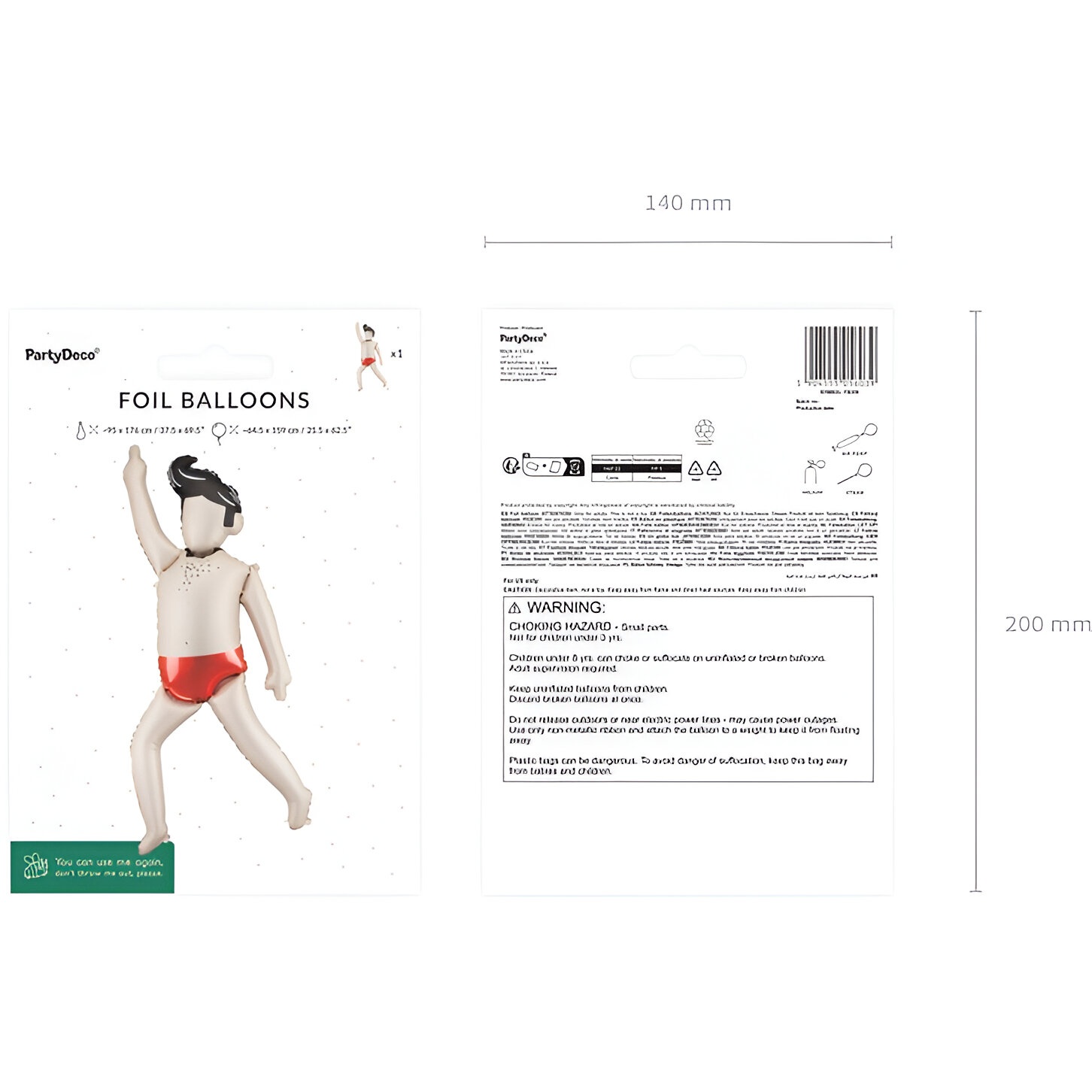 Globo foil gigante con la figura de un hombre en tonos crema y rojo, con cabello negro y detalles divertidos. Antes del inflado mide aproximadamente 95 x 176 cm; una vez inflado alcanza aproximadamente 64.5 x 159 cm. Se puede inflar con aire o helio para adaptarlo a diferentes montajes y decoraciones. Aporta un elemento llamativo y fotogénico a photocalls, cumpleaños y celebraciones, creando una atmósfera divertida y original. Diseño ligero que facilita su colocación y combinación con otros elementos de fiesta.