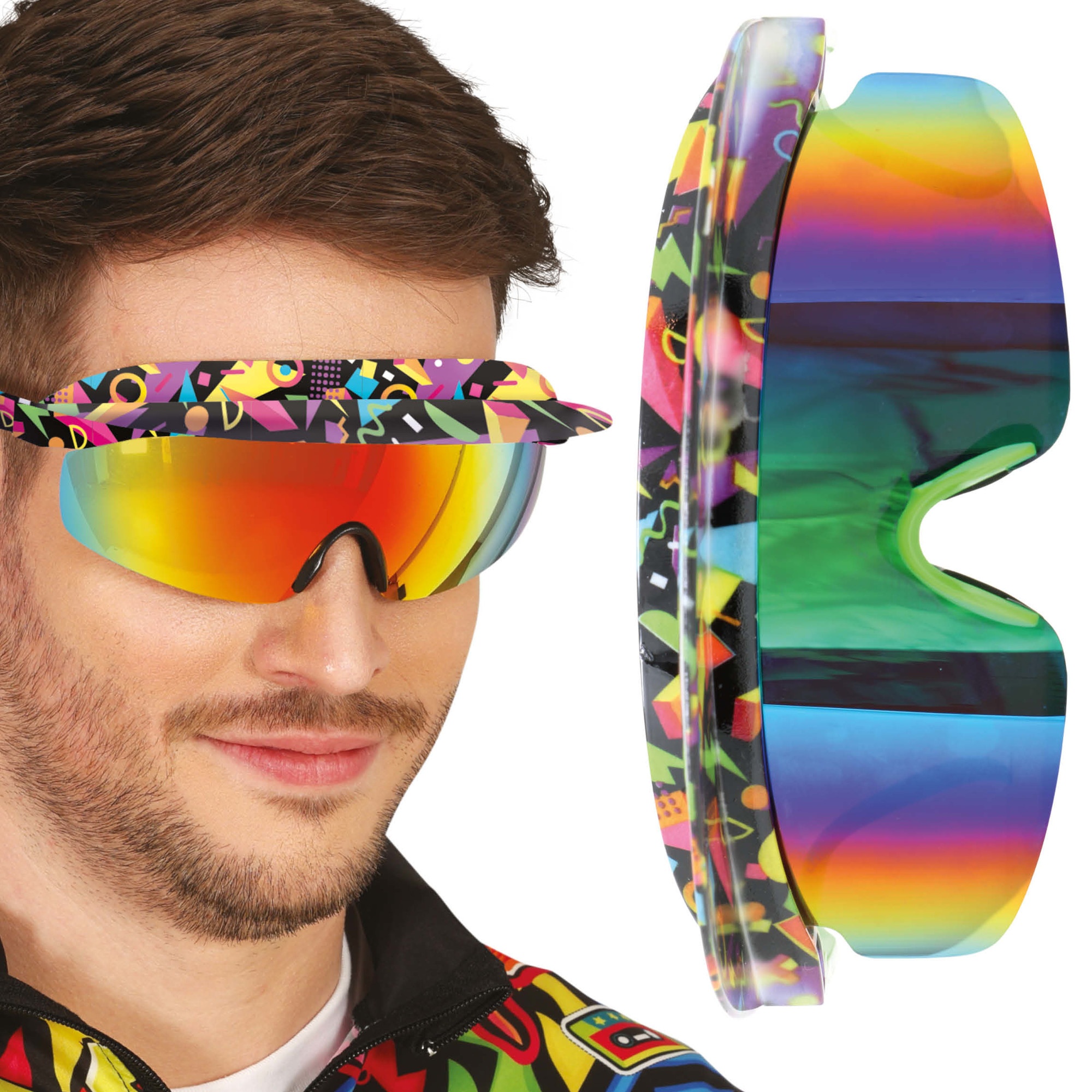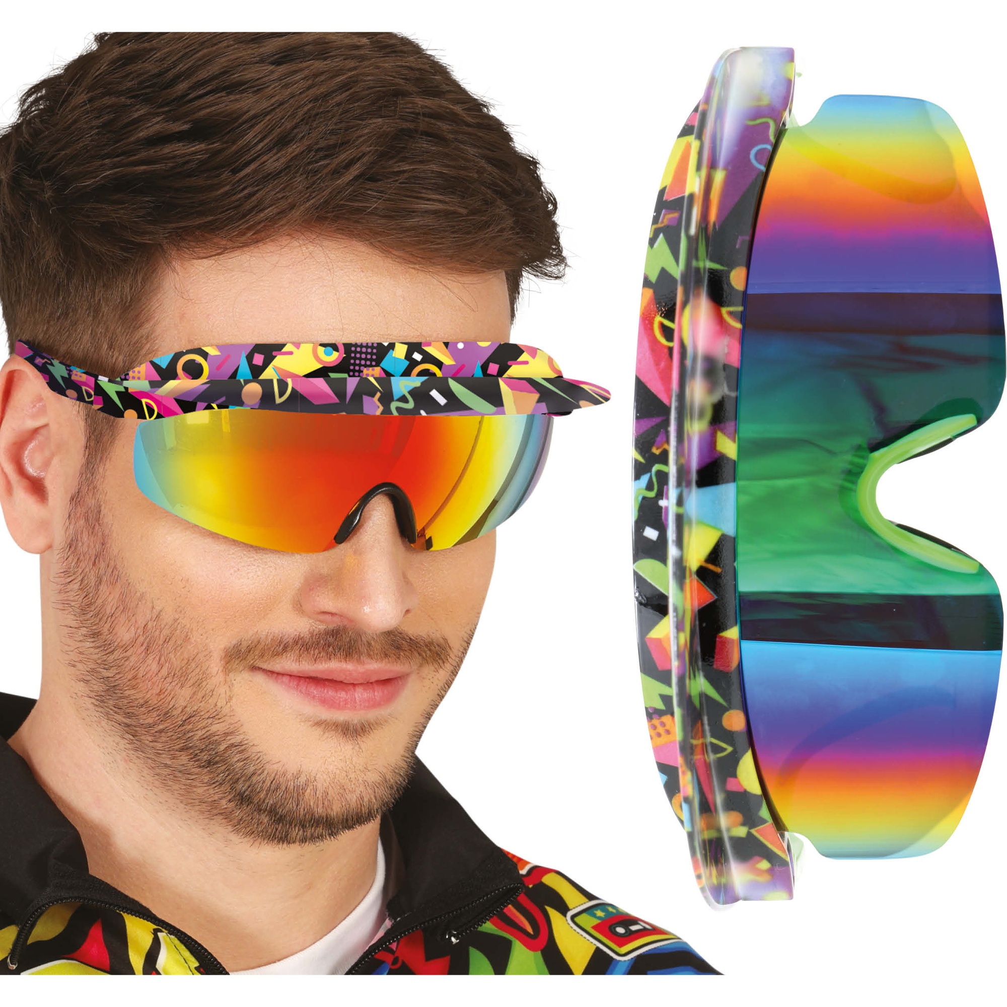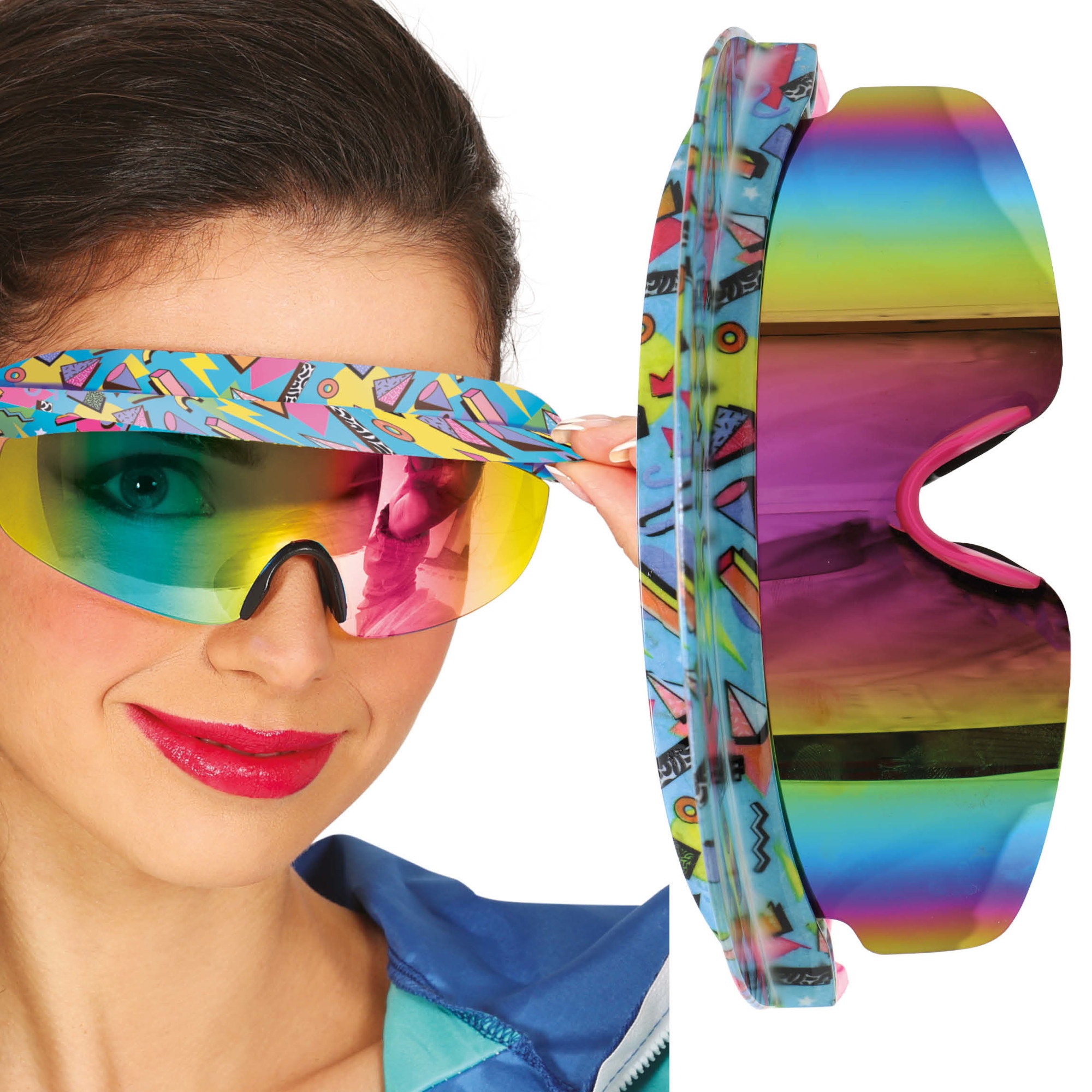 Gafas 80s con diseño visor deportivo y lente espejo de colores intensos. La montura envolvente aporta un look ochentero inmediato y muy llamativo. Disponen de correa elástica ajustable para un ajuste seguro y cómodo. Ligeras y ergonómicas, pensadas para llevar durante horas sin molestias. Ideales para quienes buscan un accesorio retro y con presencia.