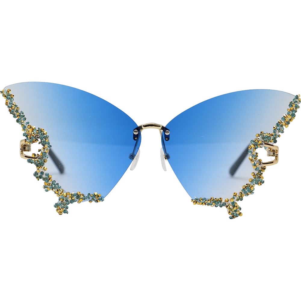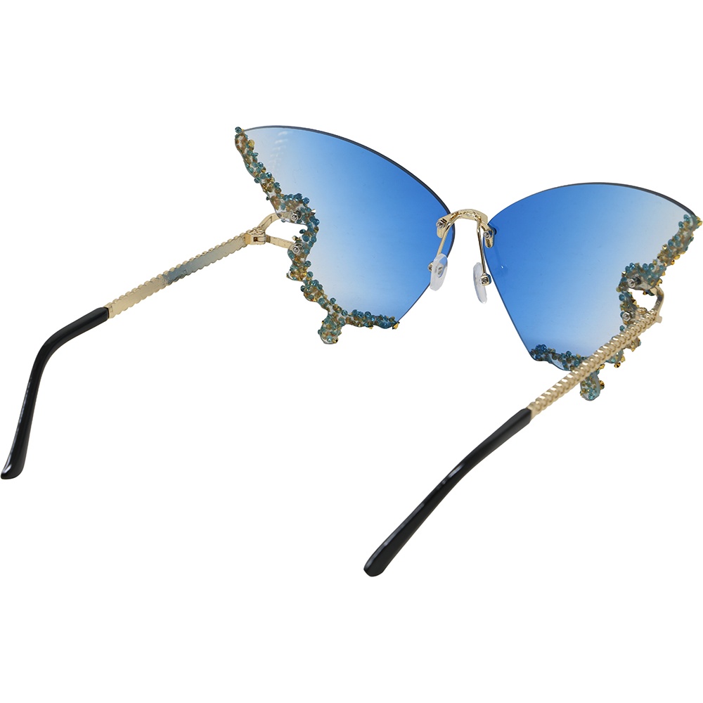 Gafas mariposa con pedrería que añaden un toque boho y llamativo a tu look. Ideales para festivales y ocasiones donde quieras destacar con estilo y brillo. Lentes de vidrio tintado en azul que aportan una estética vibrante. Montura metálica ligera con plaquetas nasales para un ajuste cómodo. Detalles de pedrería aplicados que reflejan la luz y convierten cada mirada en protagonista.