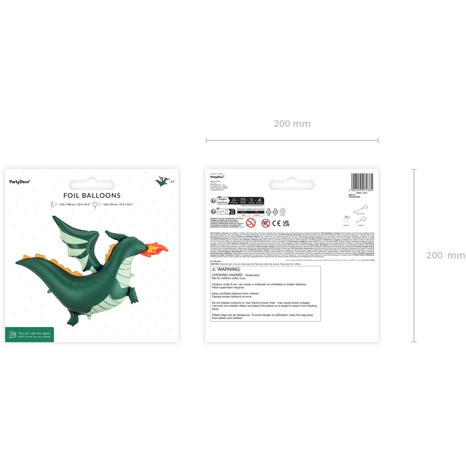 Globo con forma de dragón en tonos verde oscuro y mint, con detalle de llamas en la boca que aporta un toque divertido y espectacular a las celebraciones infantiles.