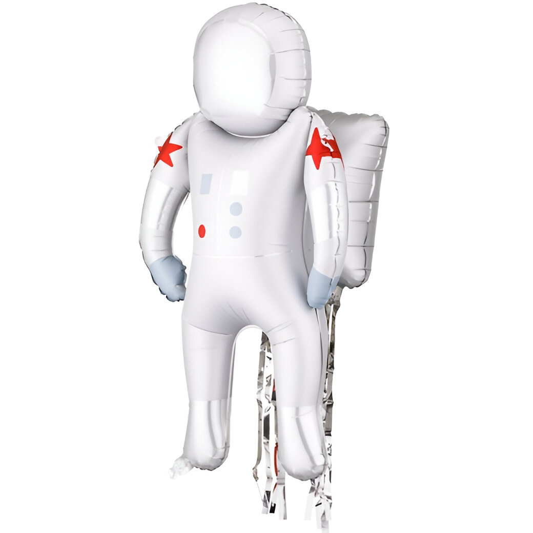 Globo foil con forma de astronauta en color plateado y detalles en rojo y celeste. Diseñado para inflado con aire, aporta un elemento divertido y llamativo a celebraciones y cumpleaños infantiles. Tamaño antes del inflado: astronauta aprox. 62 x 94,5 cm; mochila aprox. 32 x 40 cm. Tamaño después del inflado: aprox. 45 x 81 cm. Incluye pajita para inflado manual. Perfecto para decorar photocalls, mesas o rincones temáticos con estilo espacial.