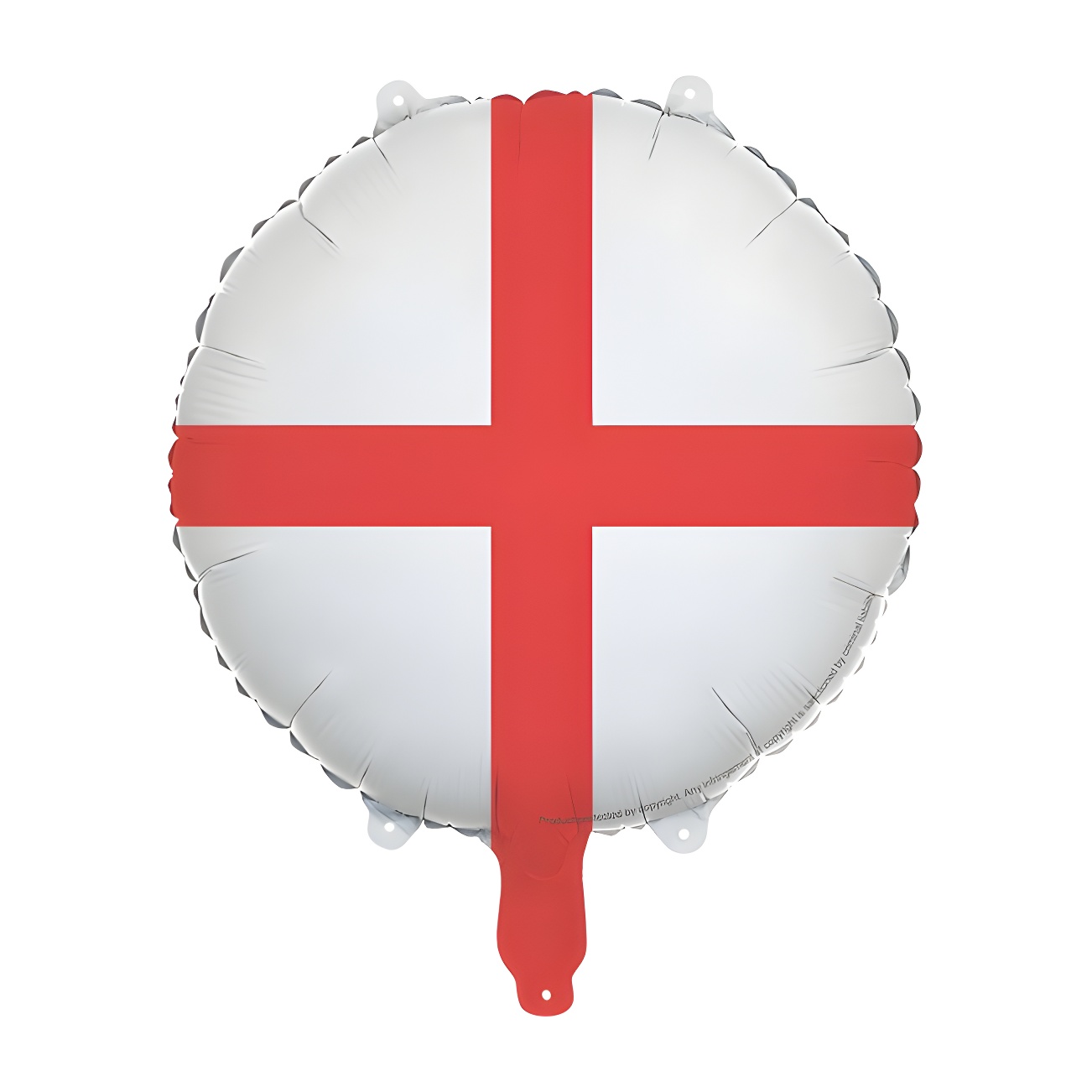 Globo foil con la icónica Cruz de San Jorge, diseñado para mostrar el apoyo a la selección y a los seguidores ingleses. Diámetro aproximado antes de inflar 45 cm (18''), y aprox. 35 cm (14'') tras el inflado. Apto para inflado con aire o helio, con válvula auto-sellante y ganchos integrados para una sujeción y decoración fáciles.