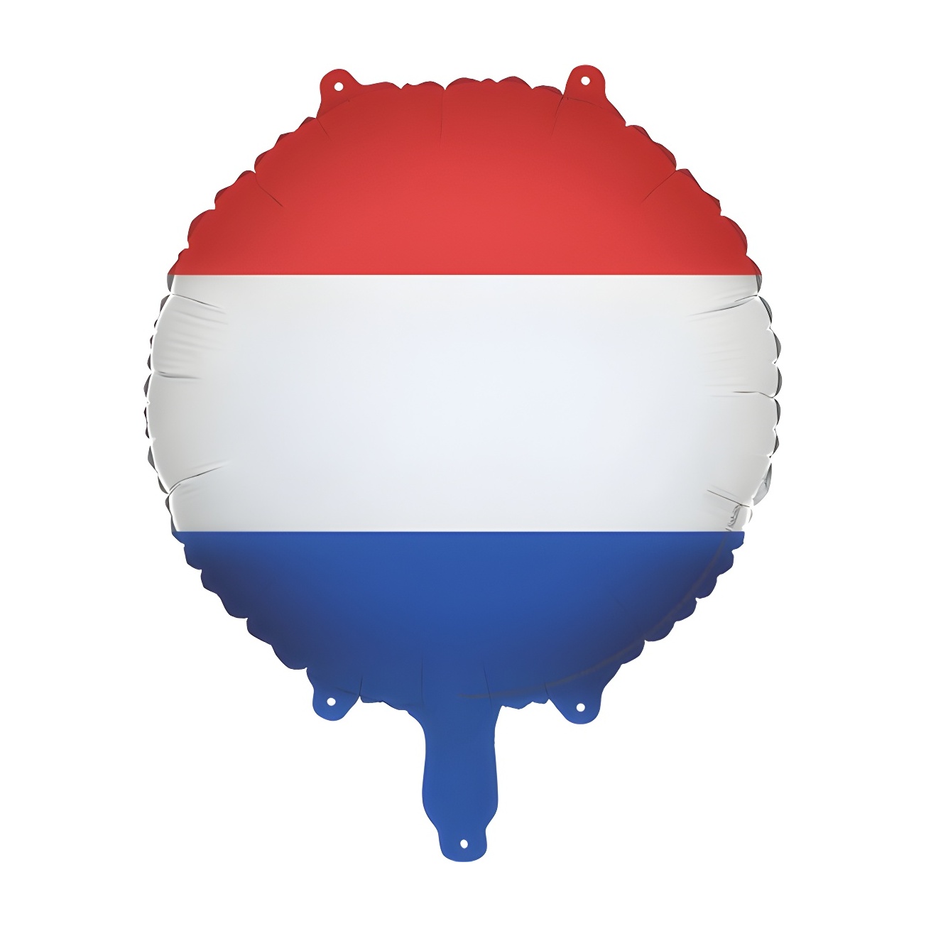 Globo foil con diseño de la bandera de los Países Bajos, perfecto para celebraciones nacionales y eventos temáticos. Diámetro aproximado antes del inflado 45 cm (18'') y tras el inflado aprox. 35 cm (14'').