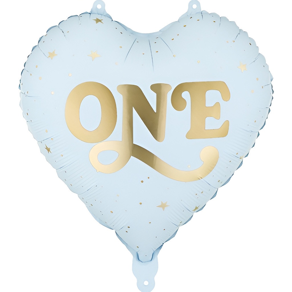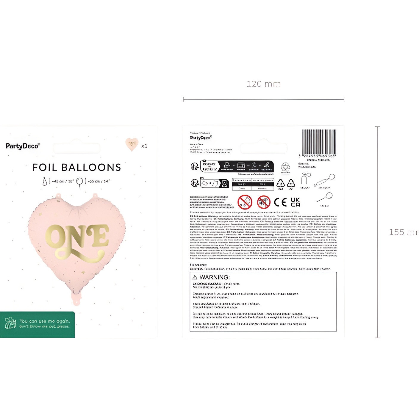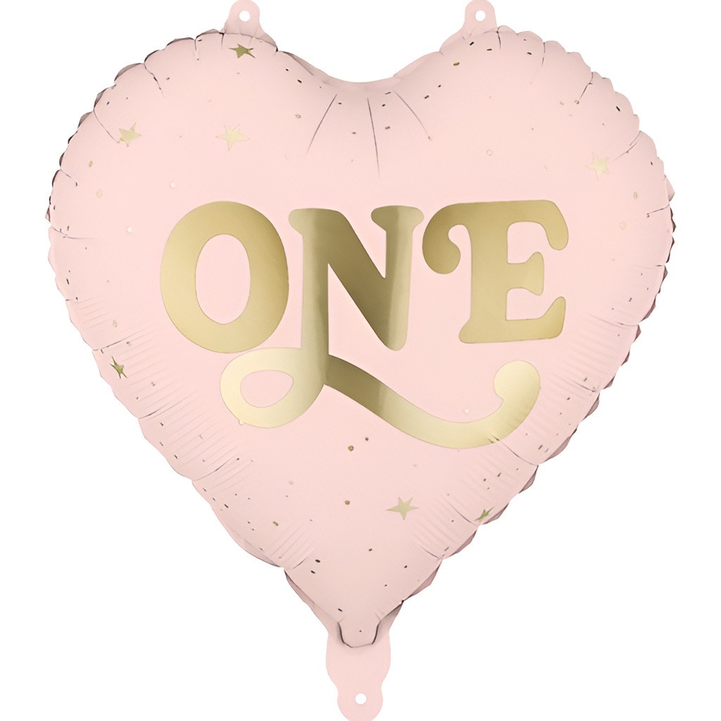 Globo foil con forma de corazón en tono rosa claro y estampado dorado "ONE", diseñado para añadir un toque elegante a la decoración de un primer cumpleaños.