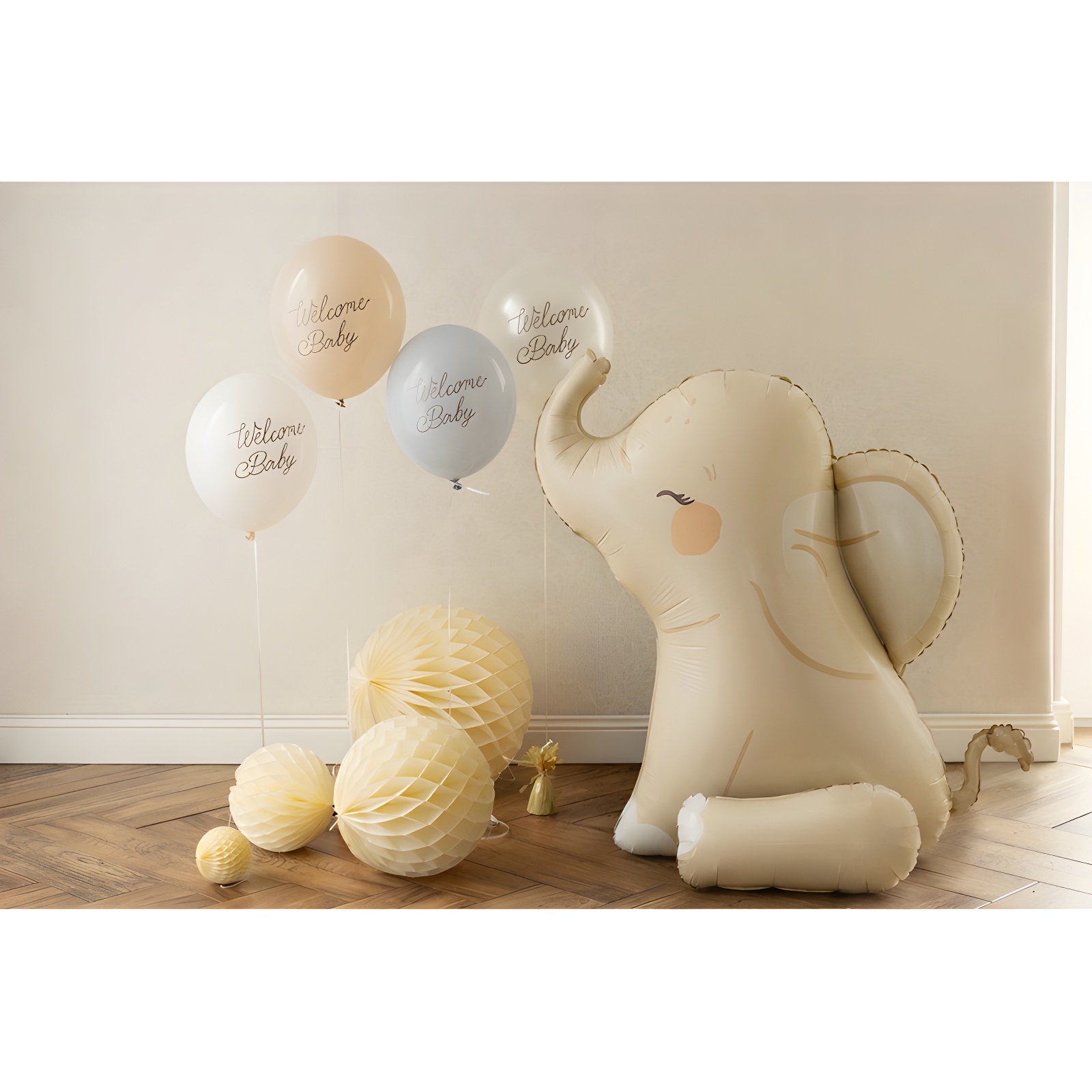 Globo foil con forma de elefante en tono beige, de aspecto tierno y expresivo pensado para complementar la decoración de celebraciones de nacimiento.