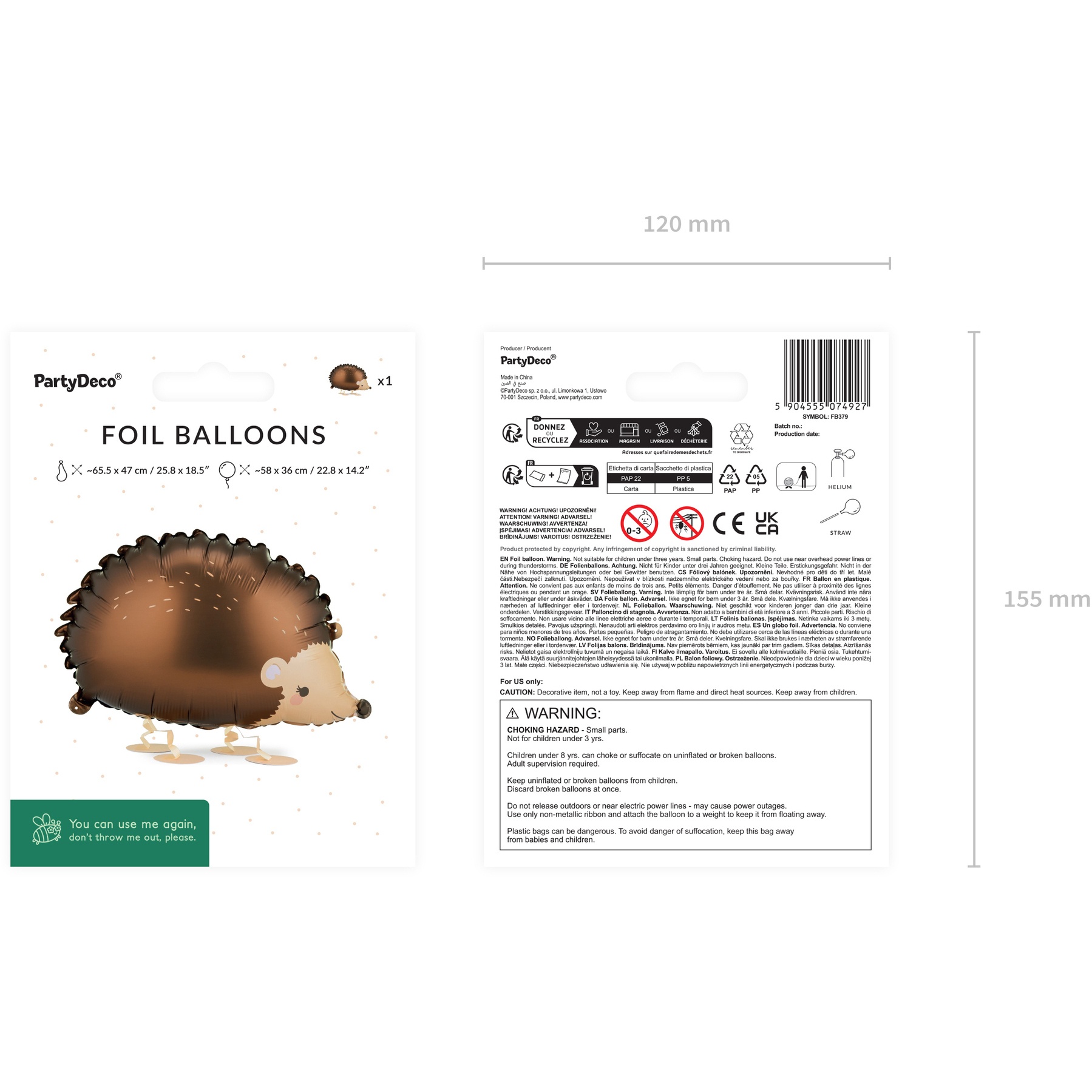 Globo foil en forma de erizo caminante en tonos marrones, con un aspecto simpático y llamativo pensado para decorar celebraciones infantiles y cumpleaños. Tamaño antes de la inflación aprox. 65.5 x 47 cm; tamaño tras la inflación aprox. 58 x 36 cm. Altura de las patas aprox. 10 cm, lo que le permite sostenerse como si caminara sobre superficies planas. Diseñado para inflado con helio y para aportar un detalle divertido y fotogénico en la decoración.