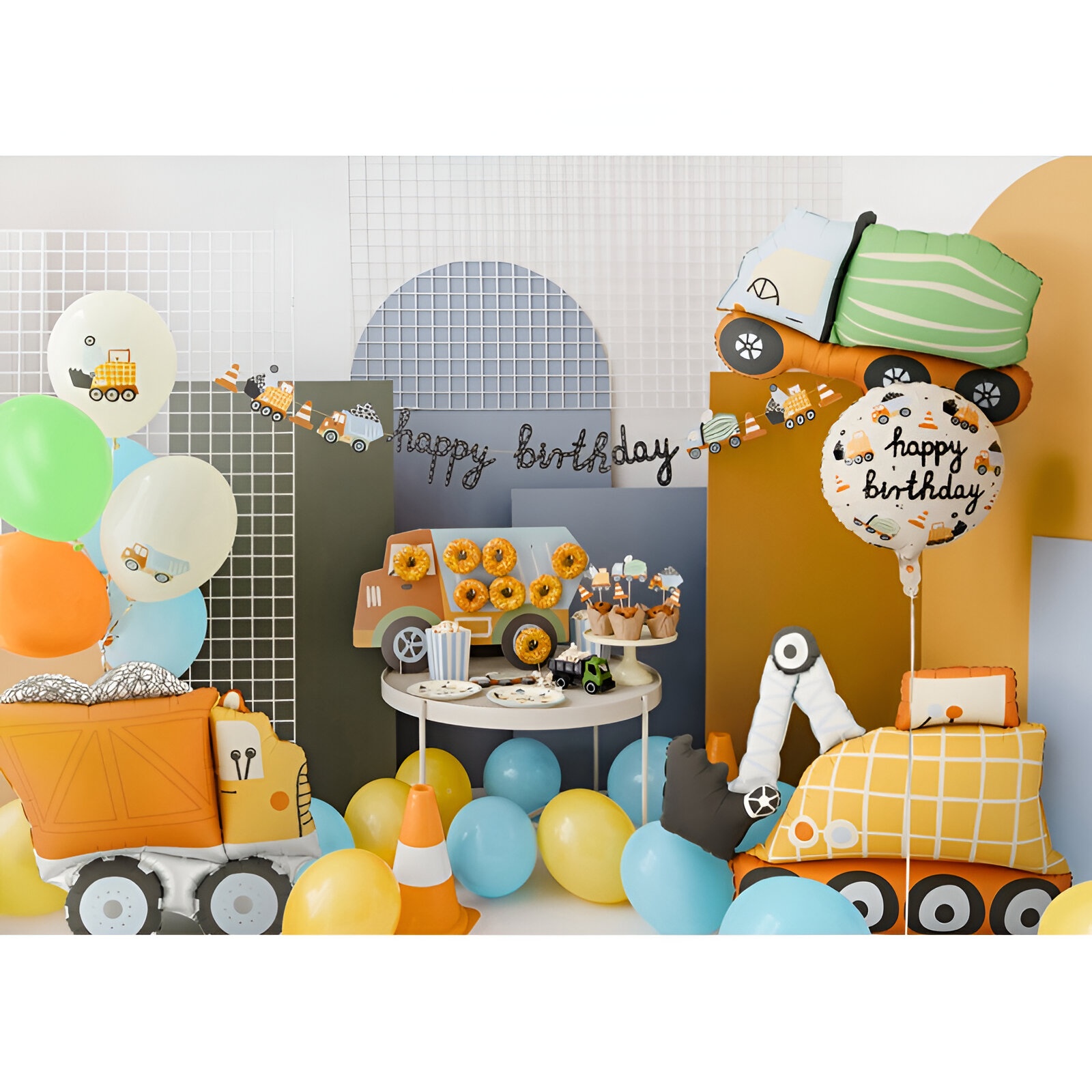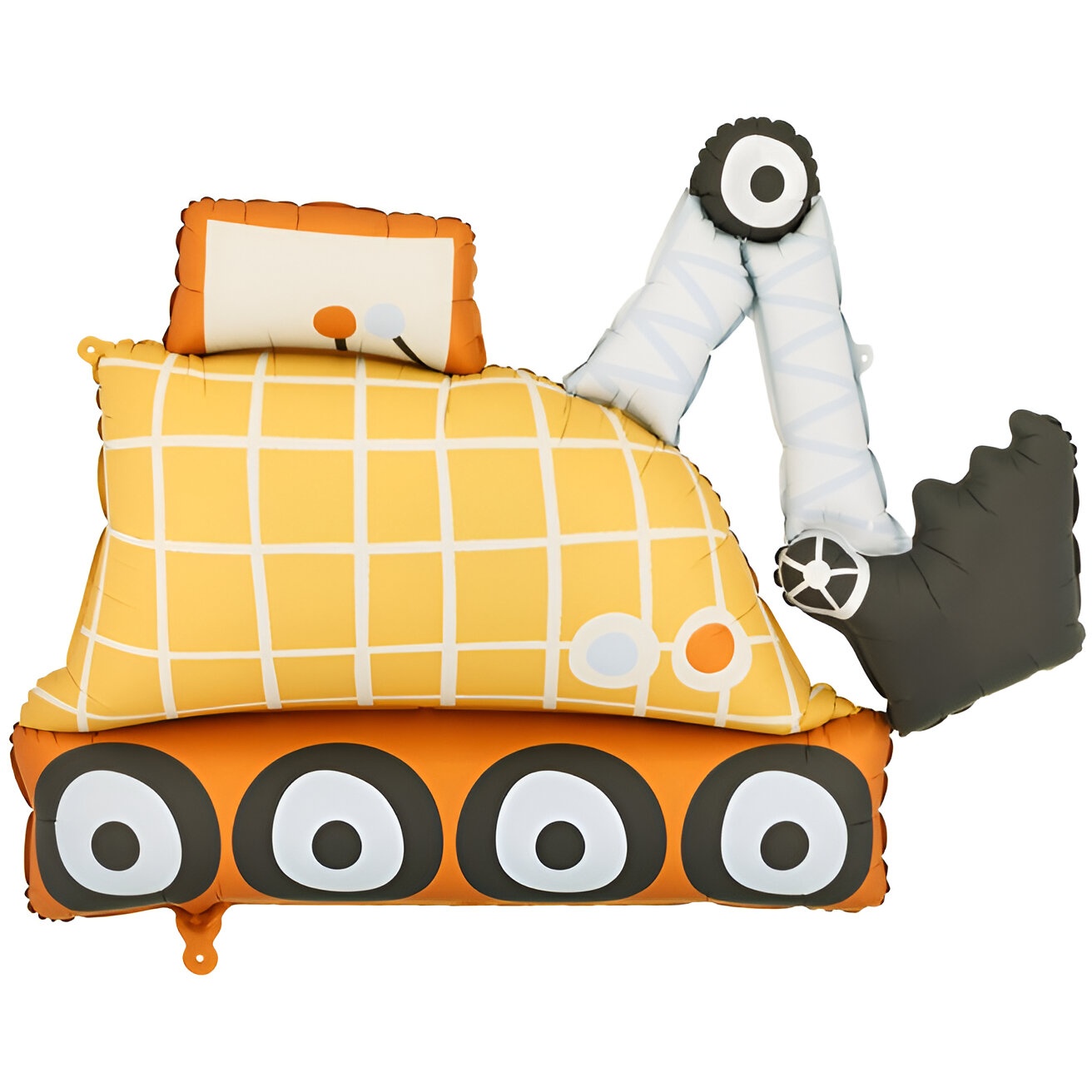 Globo foil con forma de excavadora en colores vivos, pensado para ambientar celebraciones infantiles con un toque divertido. Su tamaño antes del inflado es aproximadamente 115 x 96 cm y, una vez inflado, mide alrededor de 93 x 68 cm. Apto para inflado con aire o helio, ofrece la opción de flotar o colocarse como adorno. Superficie brillante y llamativa que realza cualquier mesa temática o photocall.