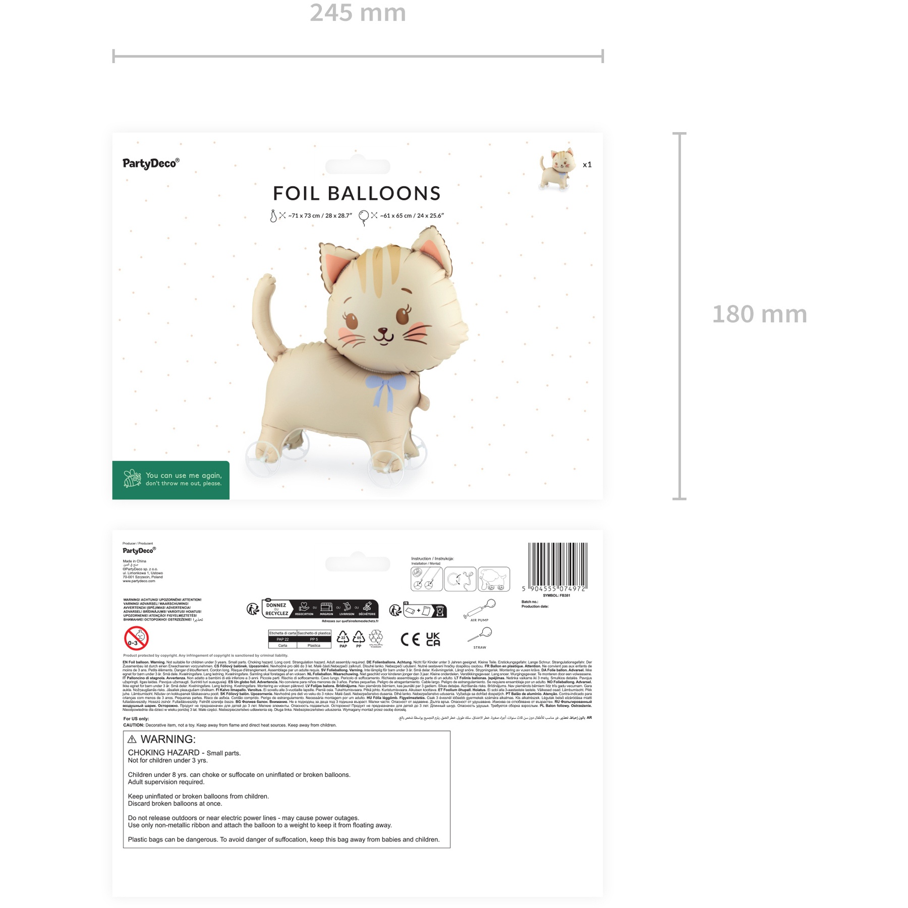 Globo foil con forma de gato en tono beige claro, diseñado para añadir un toque tierno y divertido a fiestas infantiles. Tamaño aproximado antes del inflado: 71 x 73 cm; tamaño tras el inflado: 61 x 65 cm. Para inflado con aire únicamente, mantiene una figura compacta y llamativa que atrae la atención de los niños. Ideal como pieza central decorativa en cumpleaños y celebraciones infantiles.