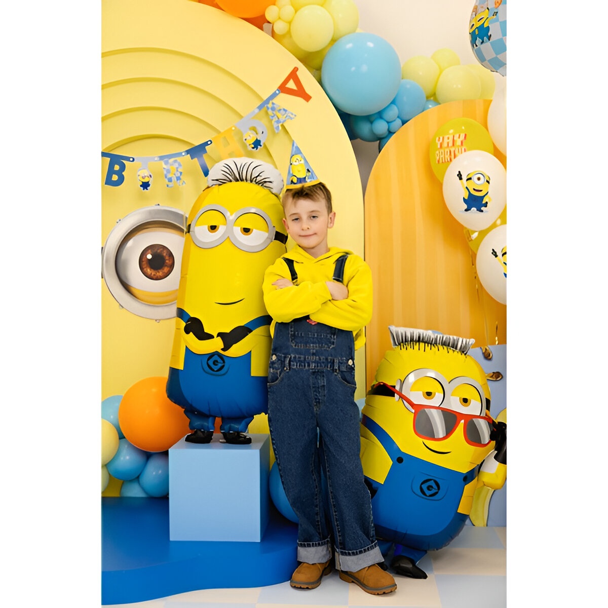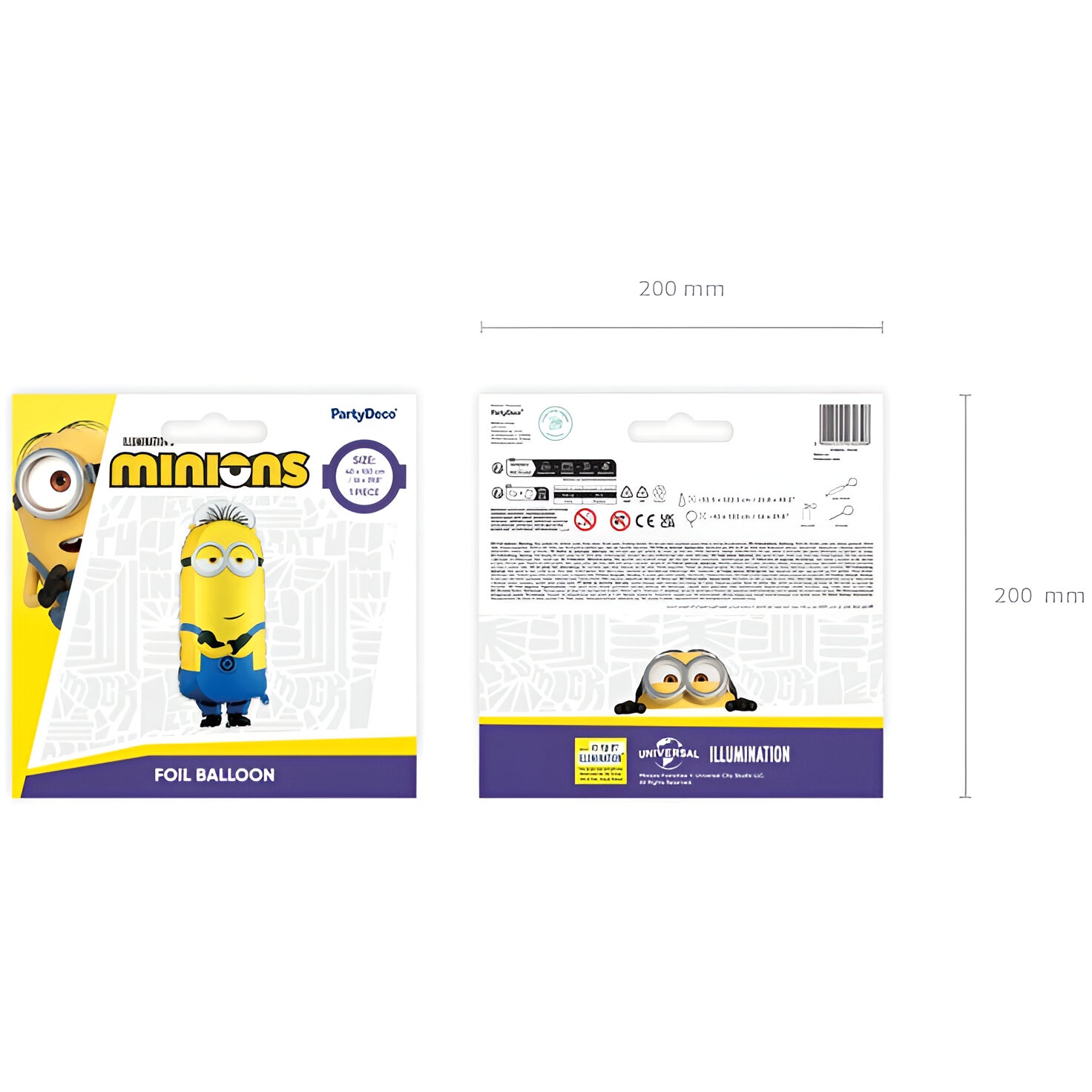 Globo foil con la forma del Minion Tim, con colores azul y amarillo y un acabado brillante que aporta alegría a cualquier celebración infantil. Antes de la inflación mide aproximadamente 55.5 x 122.5 cm y, una vez inflado, alcanza alrededor de 40 x 100 cm. Se puede inflar con aire o helio según la necesidad; su válvula es auto-sellante para un cierre rápido y seguro. Dispone de ojales integrados para colgarlo o sujetarlo con facilidad y mantener la decoración estable.