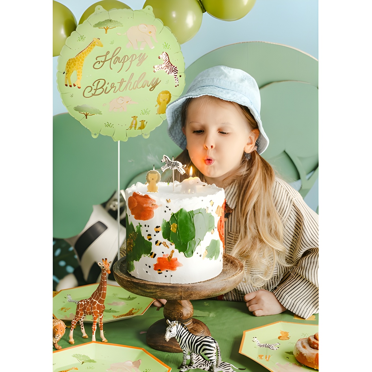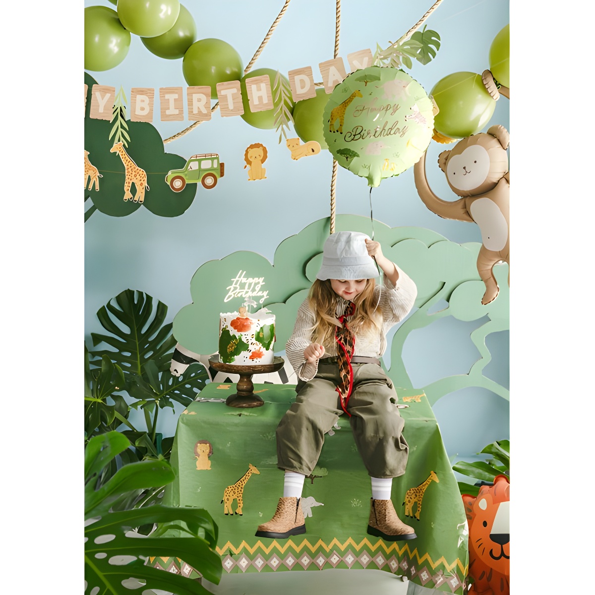 - Diseño infantil con animales del safari (jirafa, elefante, cebra, león) perfecto para cumpleaños temáticos.