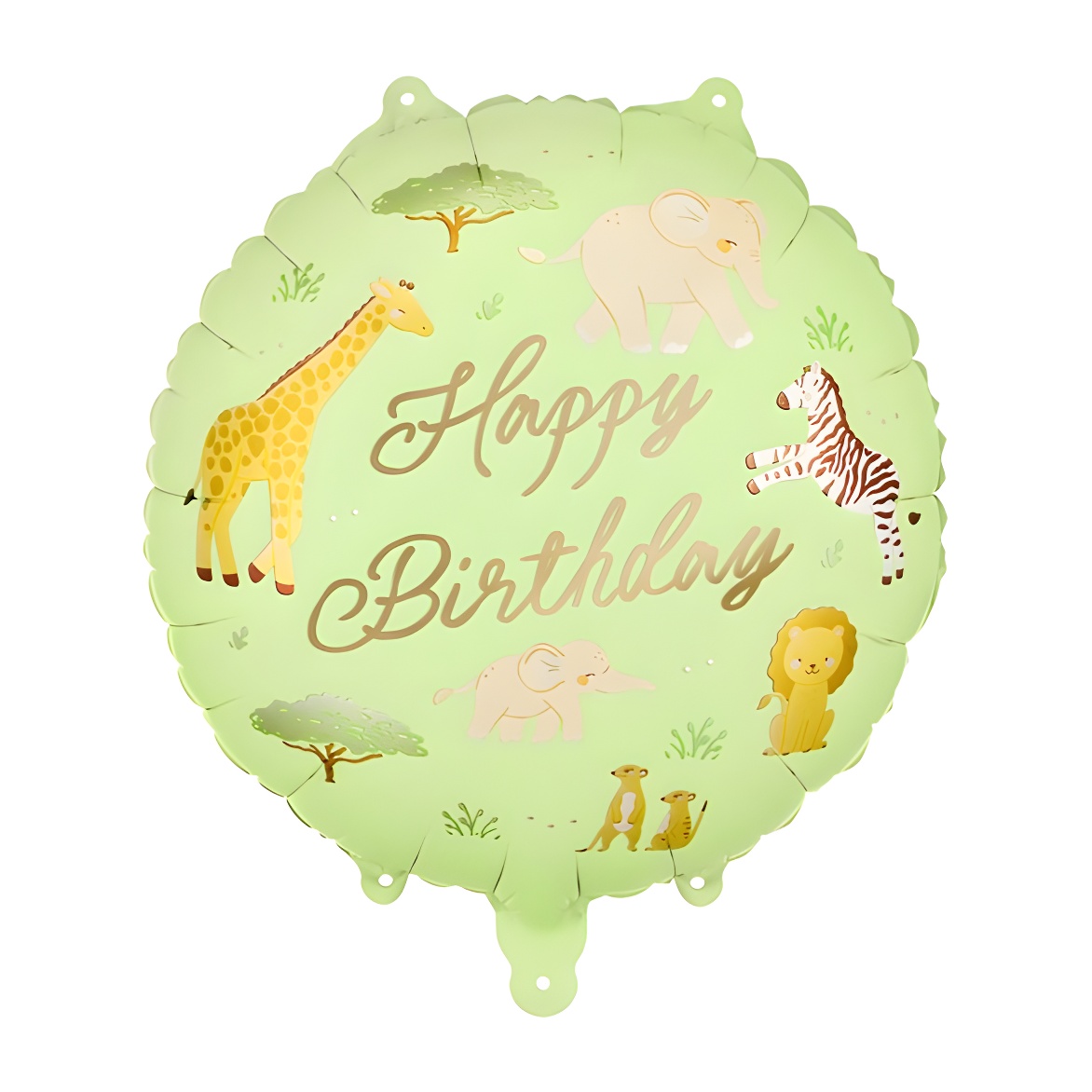 Decora la fiesta con un globo foil de diseño safari, con simpáticos animales y el mensaje Happy Birthday.