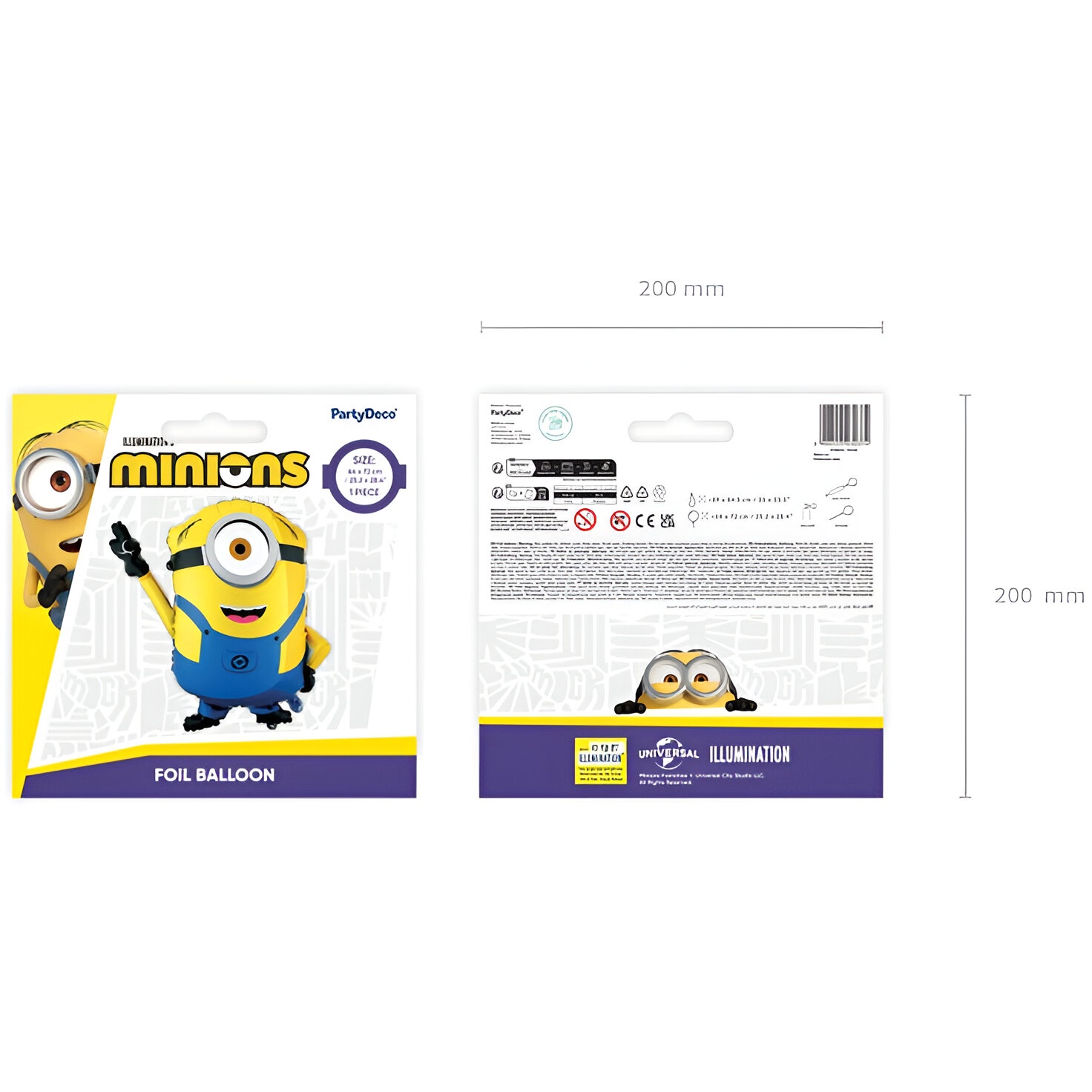 Globo foil oficial del Minion Mel en llamativos tonos amarillo y azul. Tamaño antes del inflado: aprox. 89 x 84.5 cm; tamaño después del inflado: aprox. 64 x 72 cm. Apto para inflado con aire o con helio, ideal para decorar eventos infantiles y añadir un toque divertido. El globo es autosellante y dispone de colgadores integrados para una fijación sencilla. Se incluye una sorbita para facilitar el inflado.