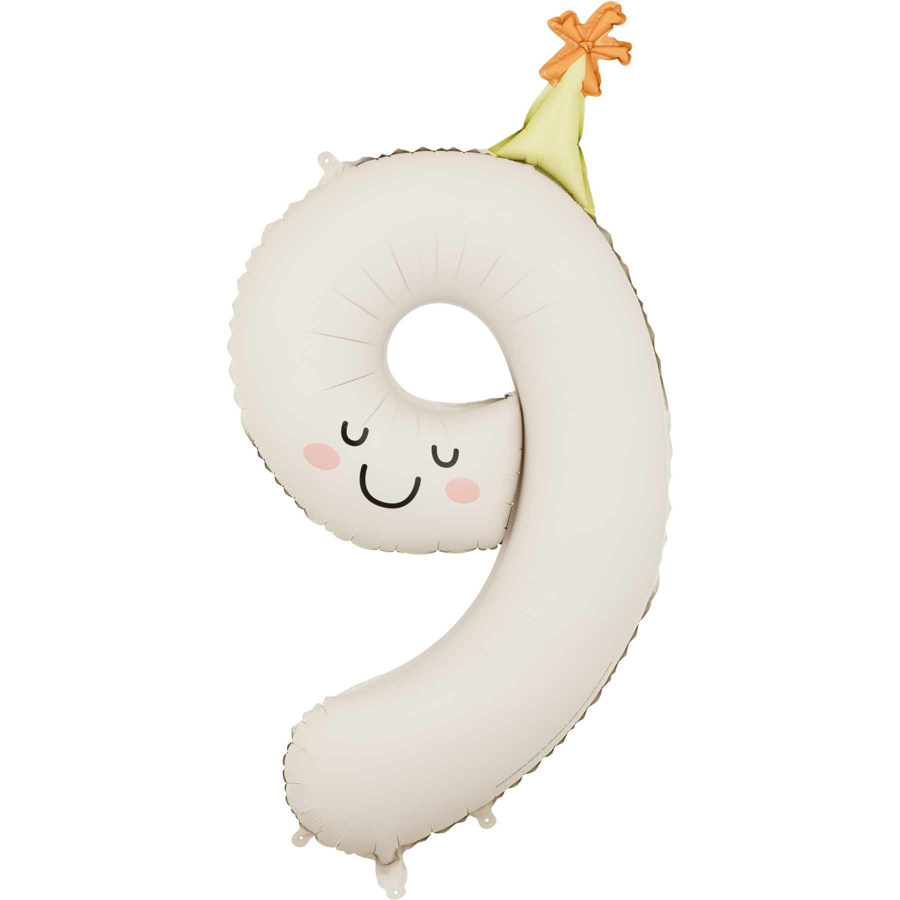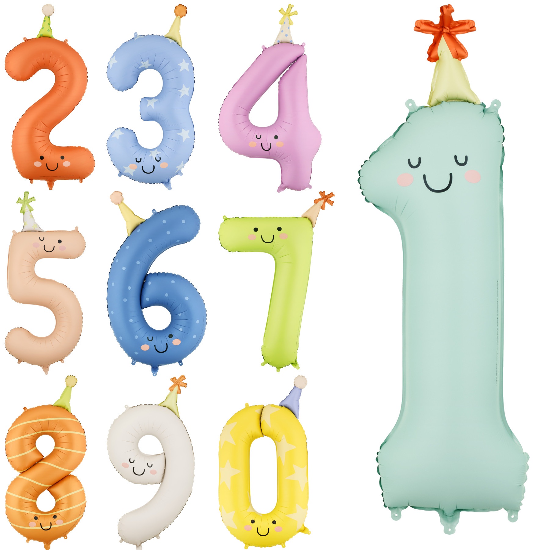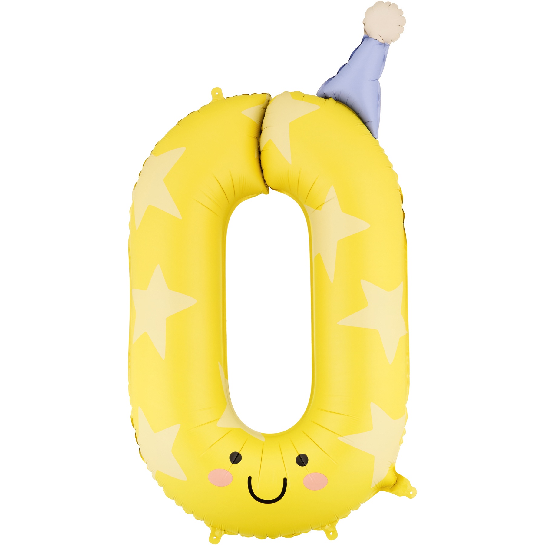 Globo foil número 0 en acabado mate, de color amarillo vibrante con una carita sonriente y un gorrito de colores que aporta un toque divertido y tierno.