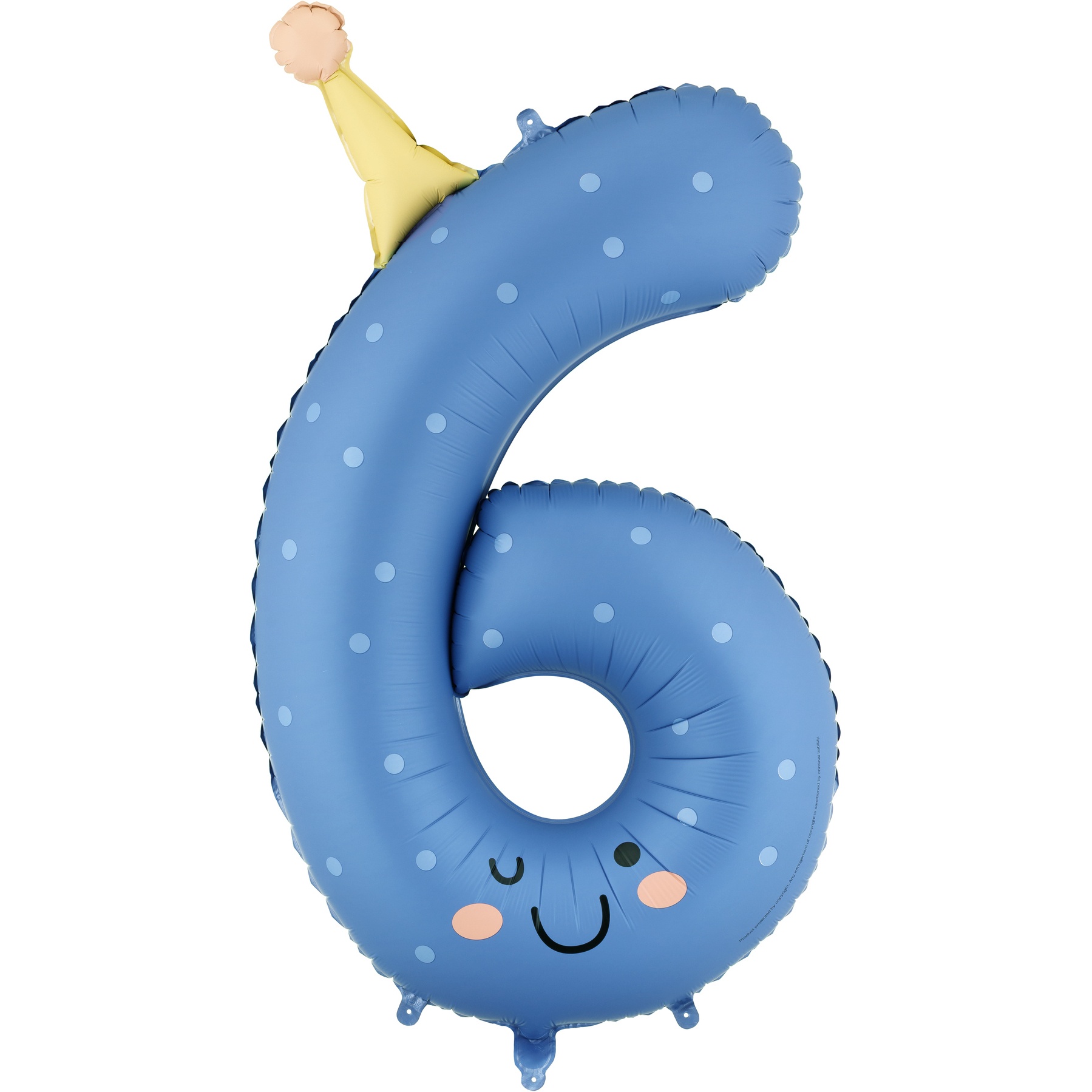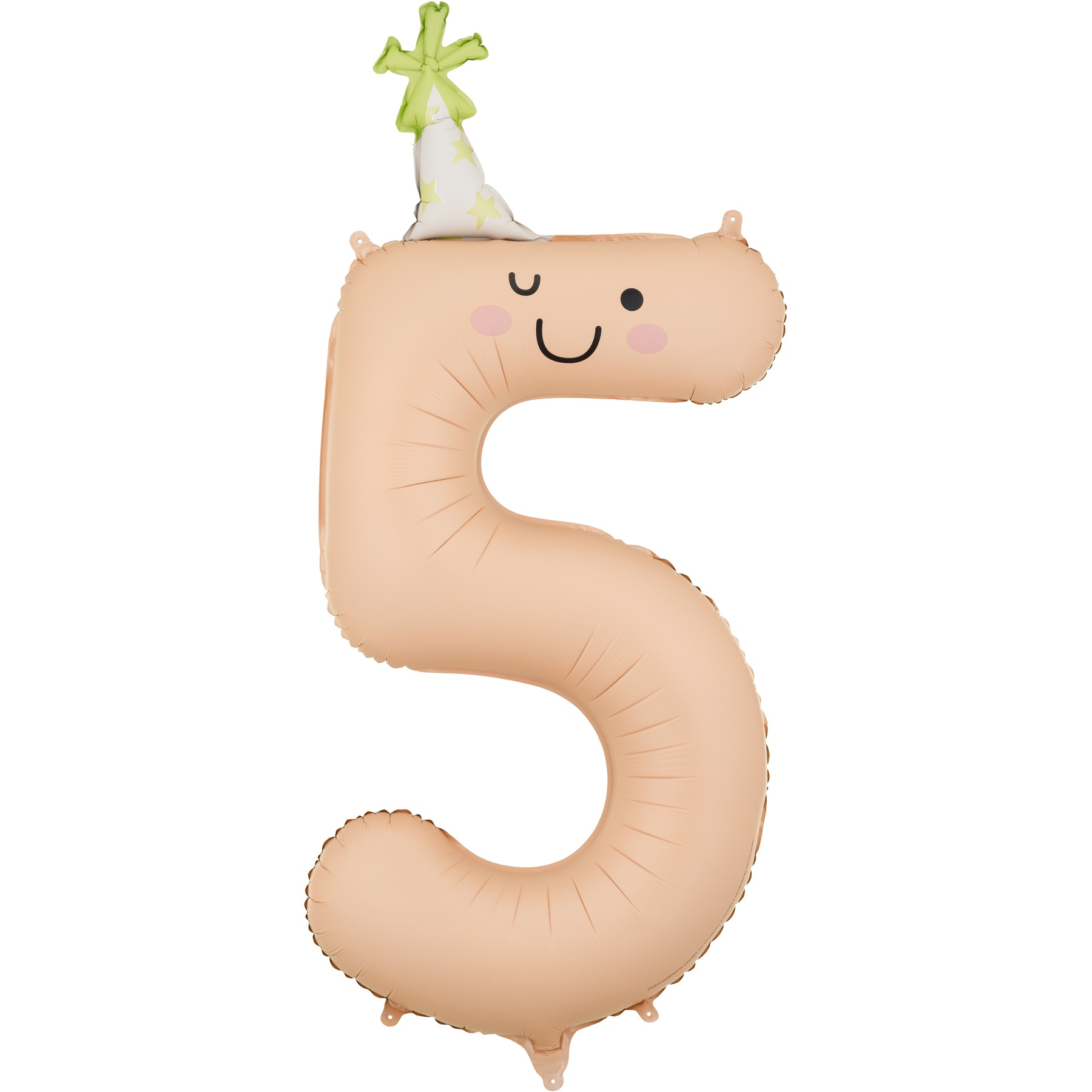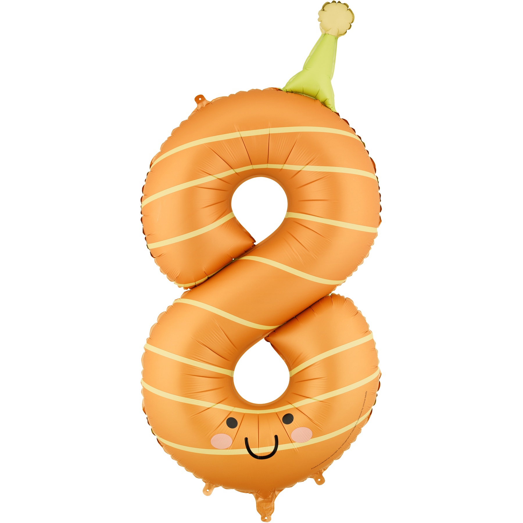 Globo foil número 0 en acabado mate, de color amarillo vibrante con una carita sonriente y un gorrito de colores que aporta un toque divertido y tierno.