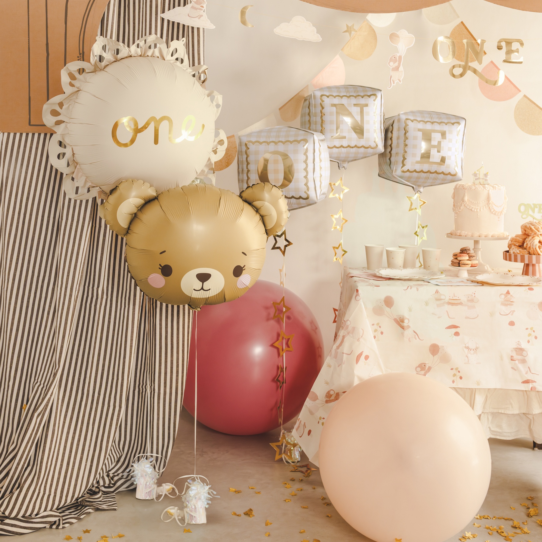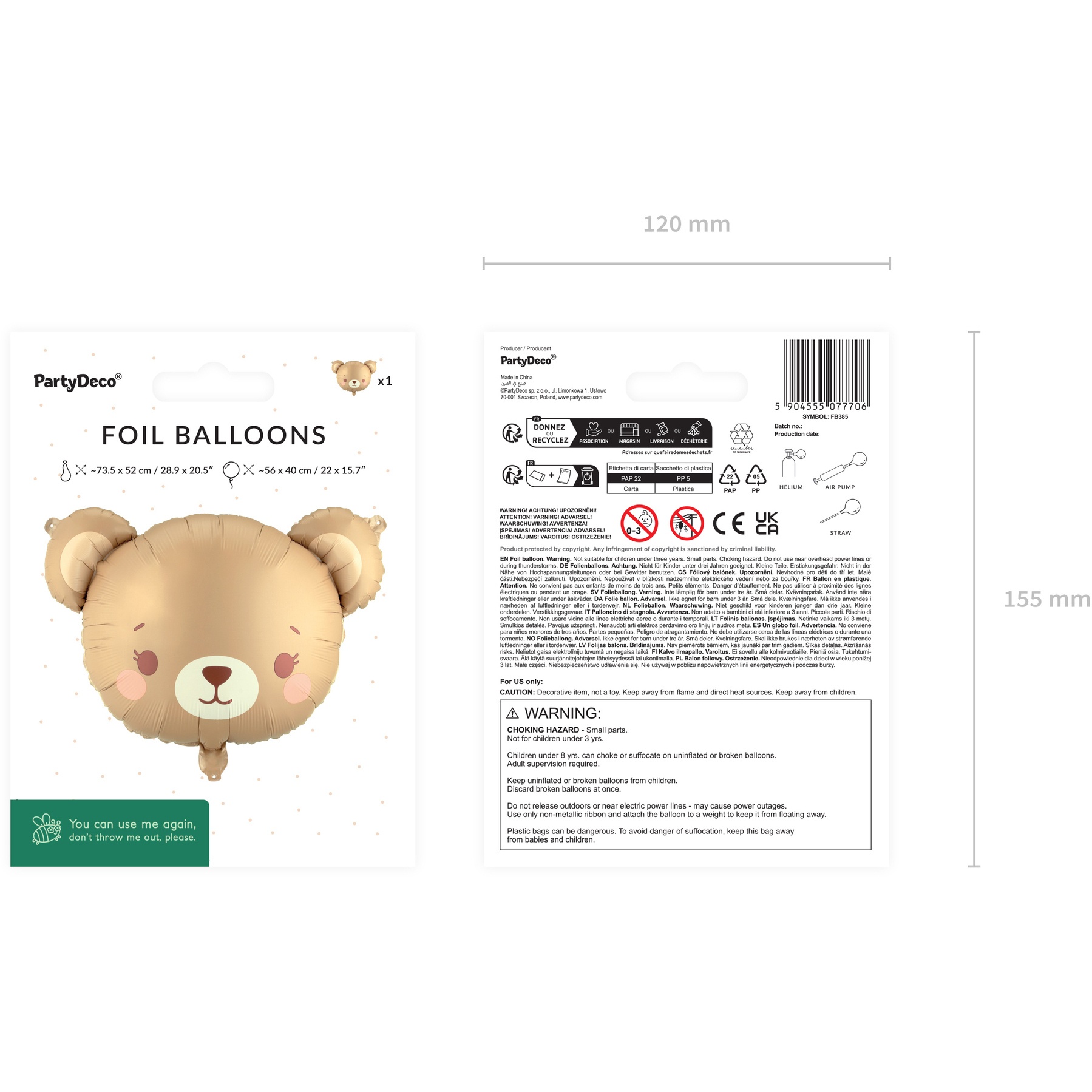 Globo foil con forma de osito en tonos beige y marrón, pensado para aportar un toque dulce a celebraciones infantiles. Tamaño antes del inflado aprox. 73.5 x 52 cm; tamaño después del inflado aprox. 56 x 40 cm. Apto tanto para inflado con aire como con helio, lo que permite colocarlo en mesas, ramos de globos o photocalls. Su acabado brillante y el diseño simpático crean una ambientación cálida y elegante en baby showers y cumpleaños de niños. Incluye una pajita para facilitar el inflado.