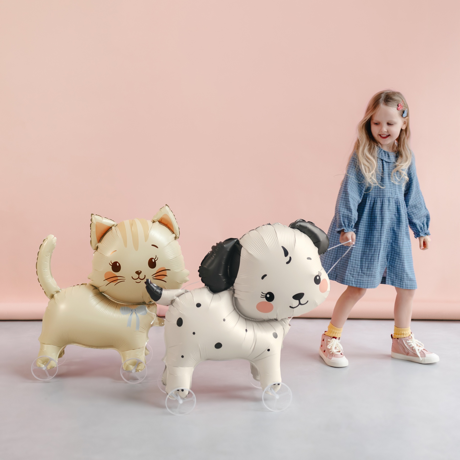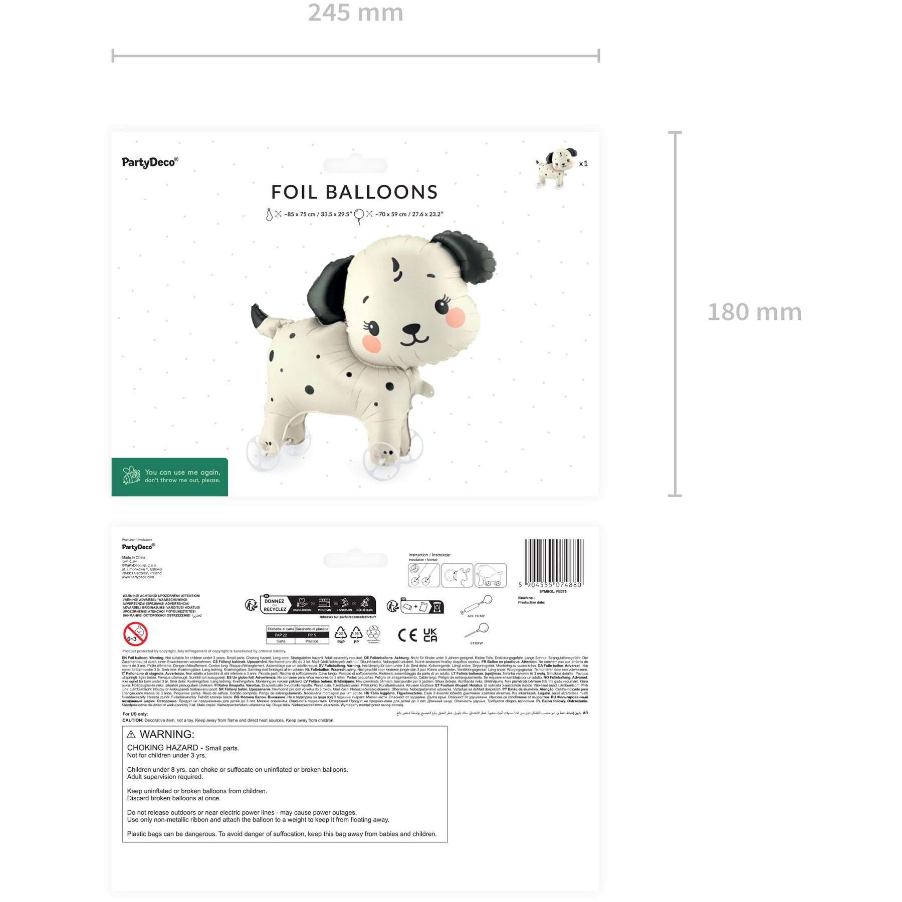 Globo foil en forma de perro con ruedas en acabado beige y negro. Su tamaño una vez inflado es de aproximadamente 70 x 59 cm, proporcionando un detalle decorativo de gran formato y gran impacto visual. Antes de inflar mide aproximadamente 85 x 75 cm. Se infla únicamente con aire, lo que facilita su montaje y exposición. Las ruedas permiten que el globo se desplace suavemente sobre superficies lisas, aportando movimiento y diversión. Diseño tierno y moderno, ideal para ambientaciones infantiles.