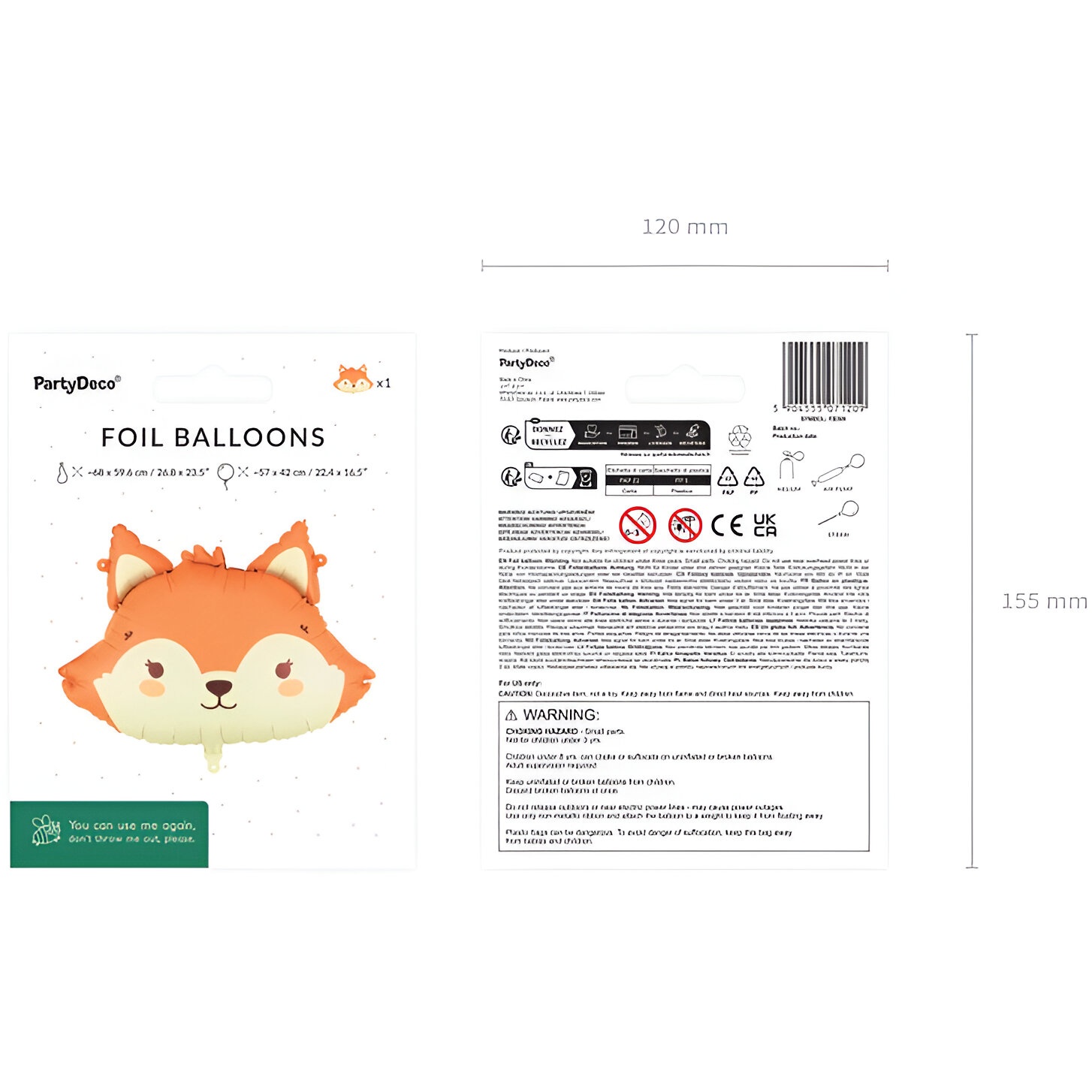 Globo foil con forma de cabeza de zorro en tonos naranja y crema. Tamaño antes de inflar aprox. 68 x 59.6 cm (26.8 x 23.5''), y después de inflar aprox. 57 x 42 cm (22.4 x 16.5'').