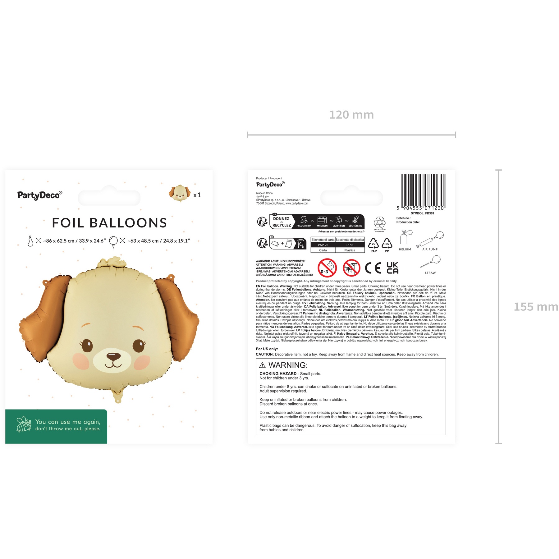 Globo con simpático diseño de perrito en tonos beige y marrón. Tamaño aproximado tras el inflado: 63 x 48.5 cm; tamaño sin inflar: 86 x 62.5 cm. Compatible con inflado con aire o helio, aporta un toque divertido y tierno a cualquier decoración infantil. Ligero y vistoso, perfecto para mesas de dulces, photocalls y rincones de fiesta.