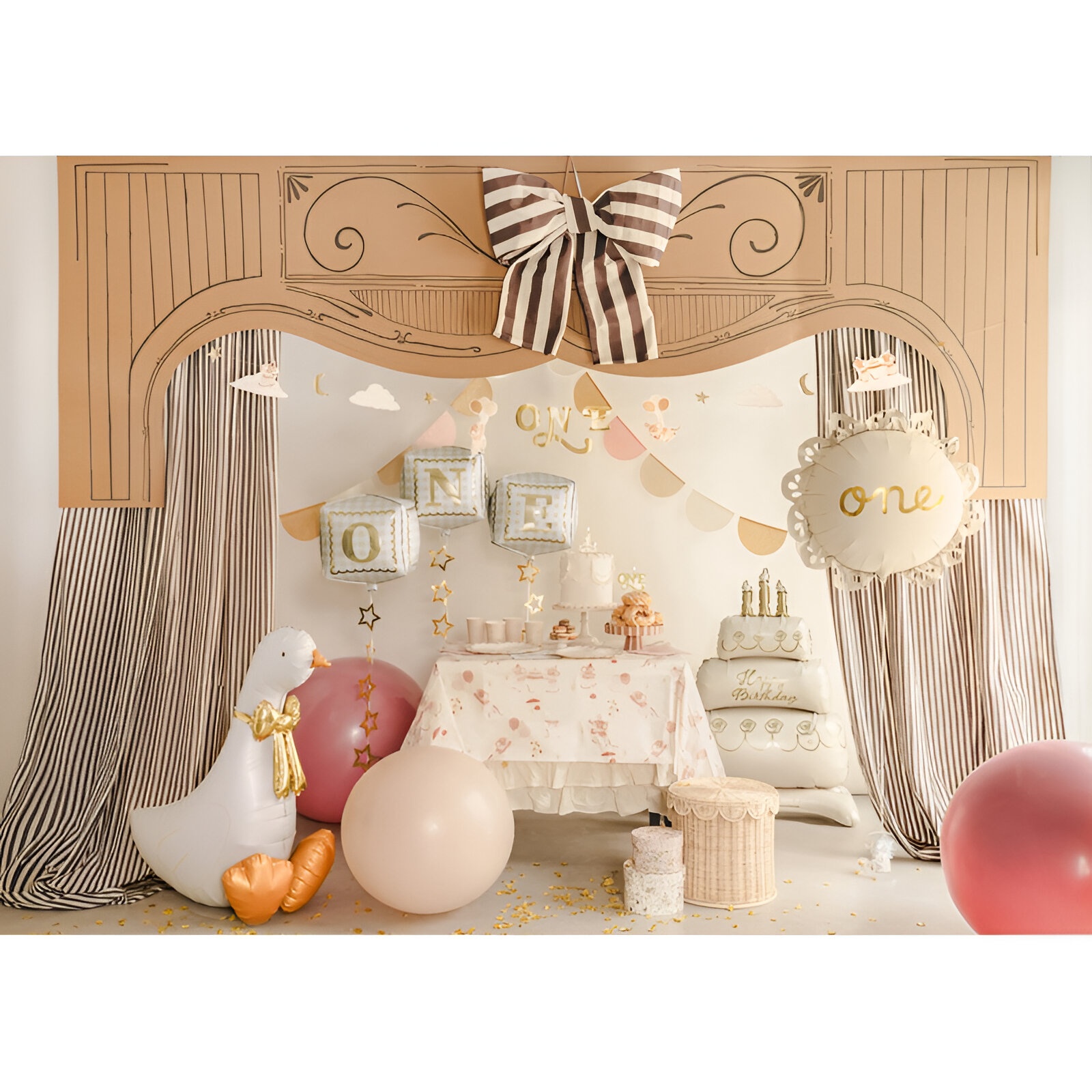 Globo decorativo en forma de ganso, con cuerpo blanco y un lazo dorado elegante para dar un toque distintivo a tus celebraciones infantiles.