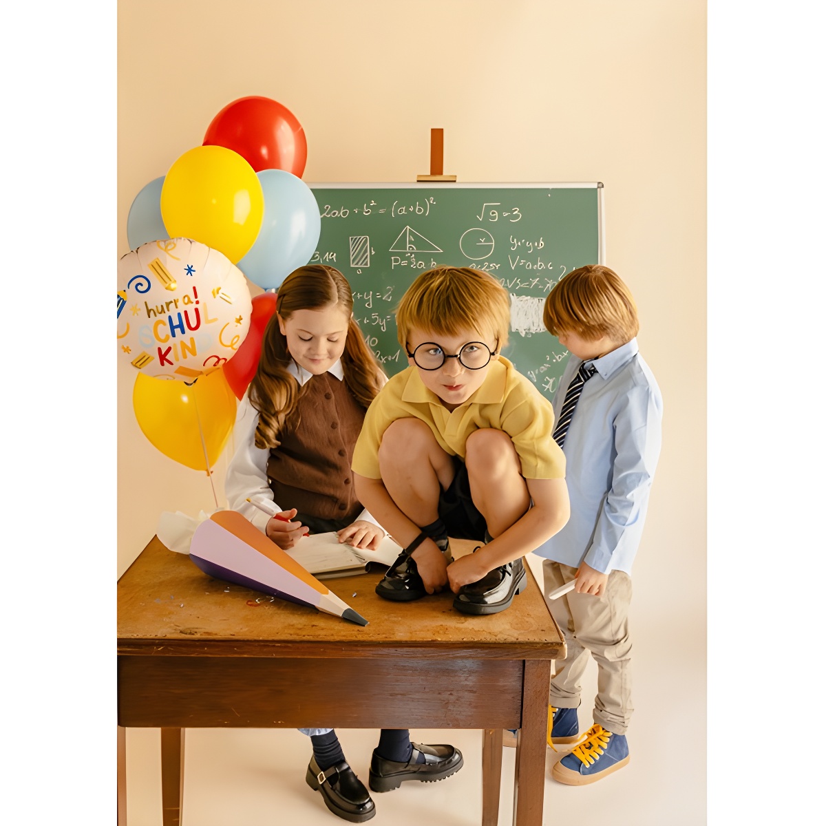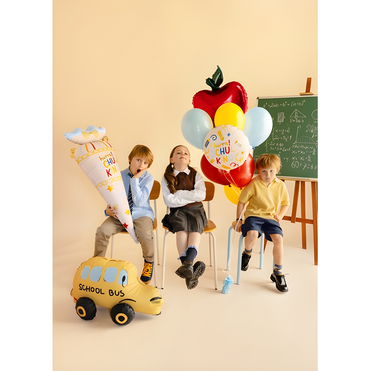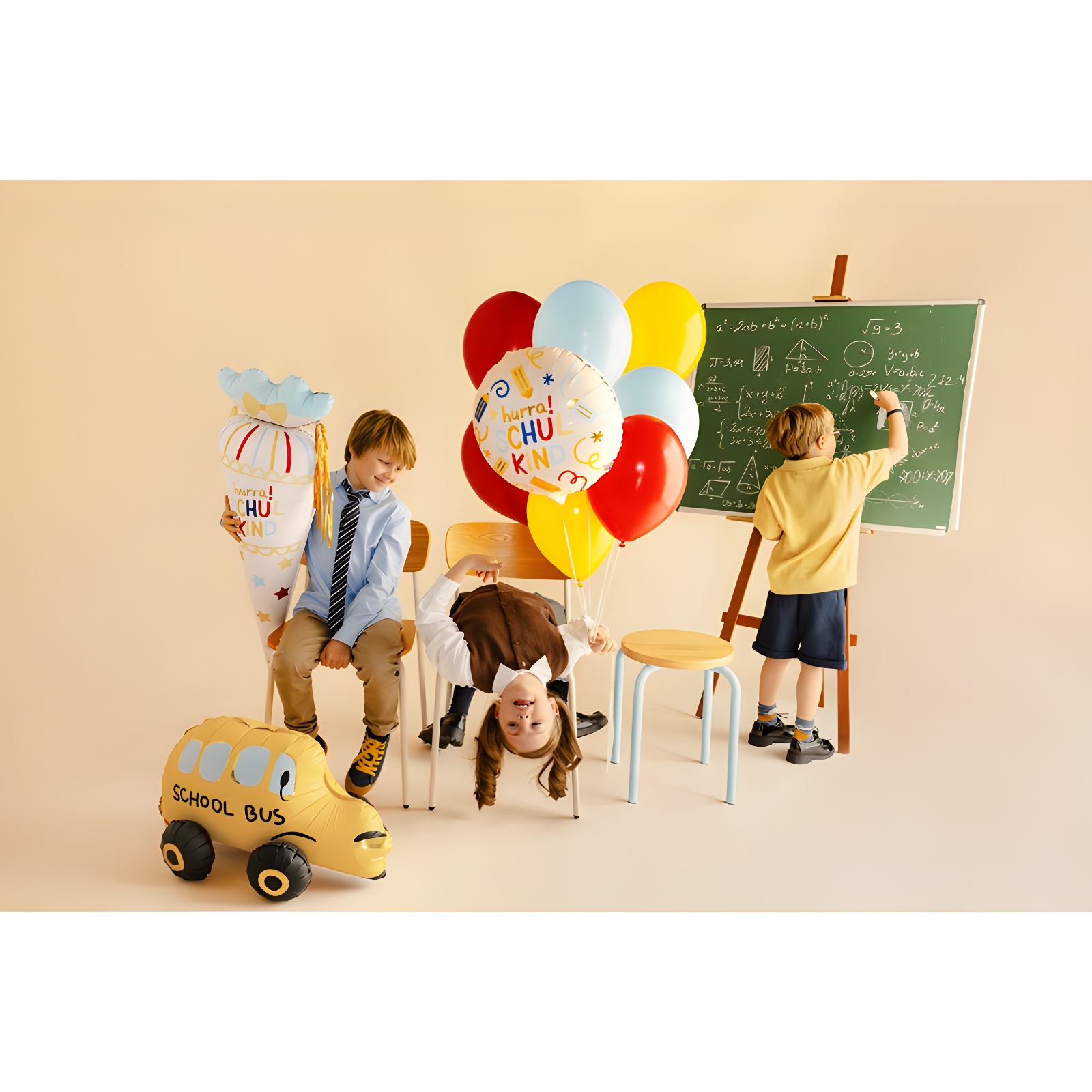 Globo decorativo con el texto Hurra Schulkind y motivos escolares en tonos crema y colores vivos. Su diseño alegre aporta un toque festivo perfecto para celebraciones relacionadas con la escuela.