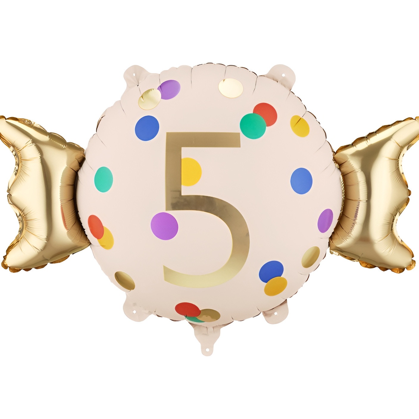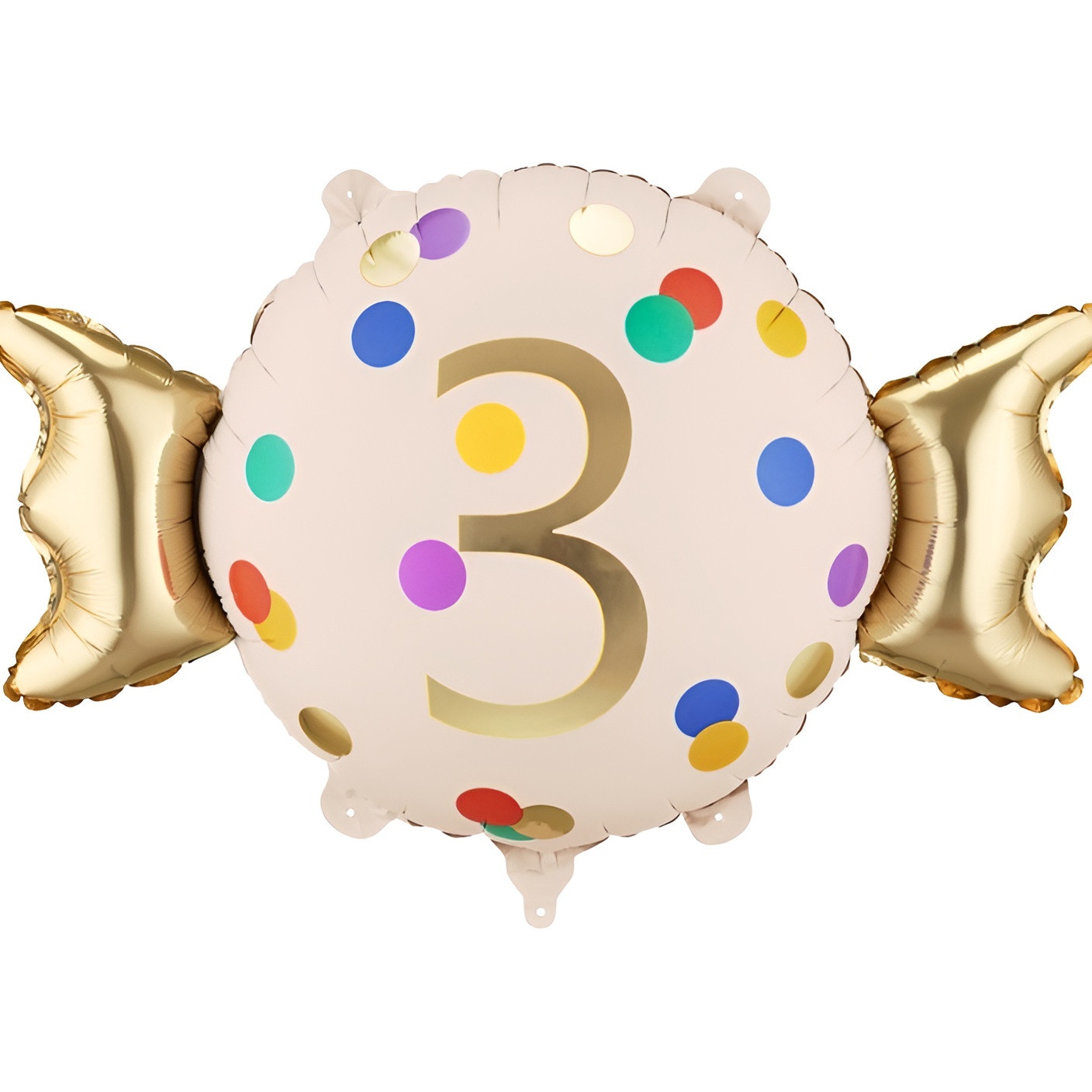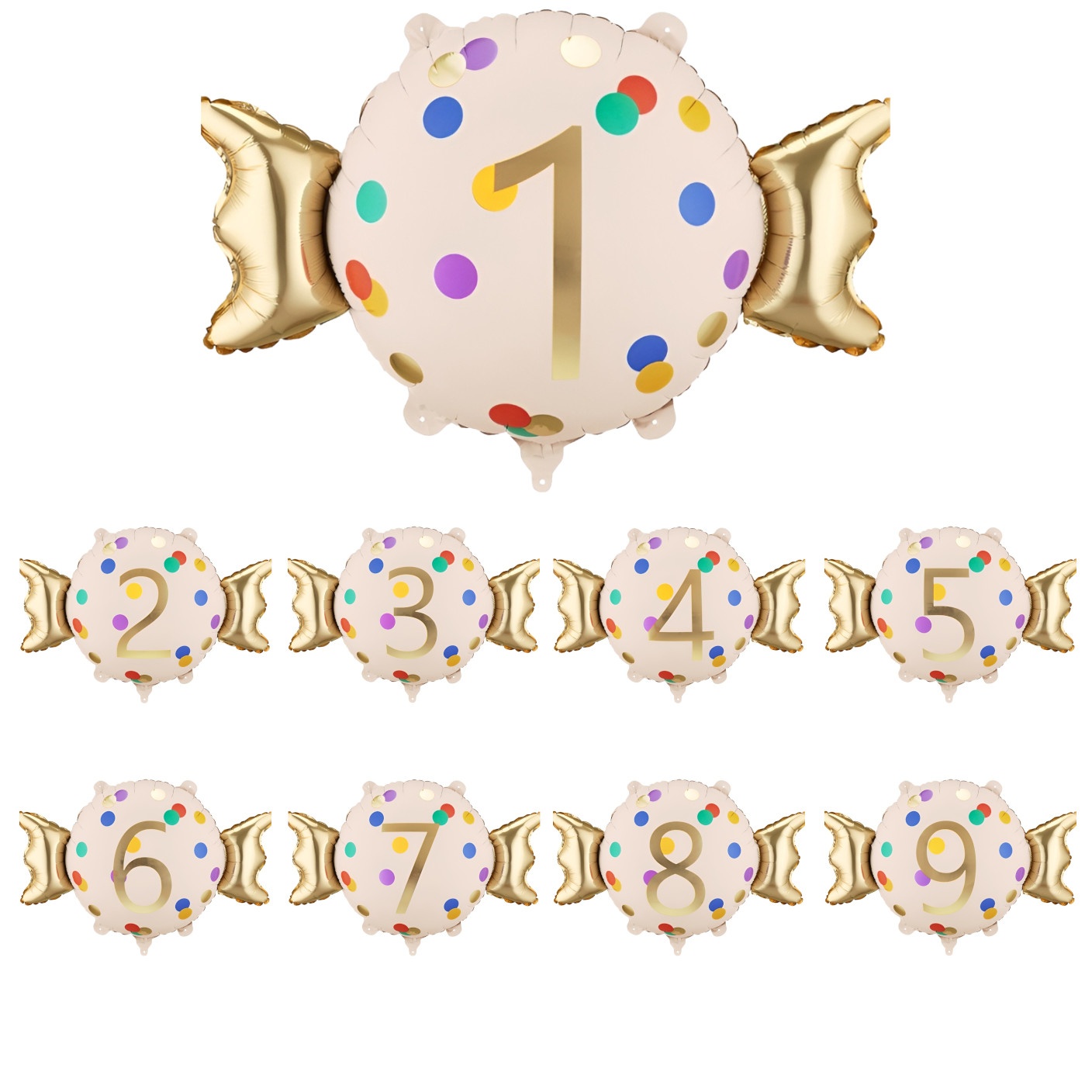 Globo decorativo con el número 1 en elegante combinación beige y dorado. Presenta un diseño tipo "candy" con lunares de colores que aporta un toque festivo y sofisticado. Tamaño aproximado antes de inflar: 76.5 x 48 cm; tamaño tras inflar: 61 x 37 cm. Apto para inflado con aire y helio y pensado para crear un punto focal en la celebración. Ideal para primer cumpleaños, sesiones de fotos y para decorar mesas dulces o rincones especiales.