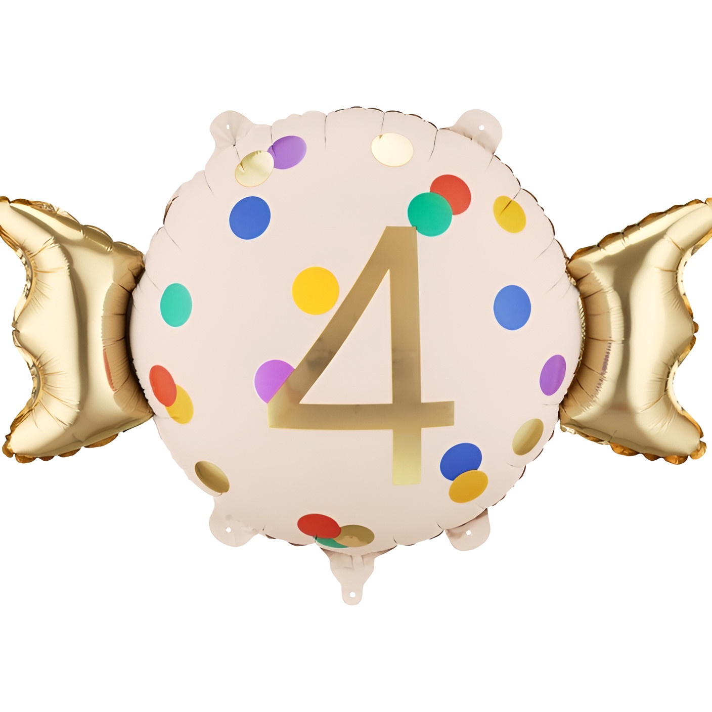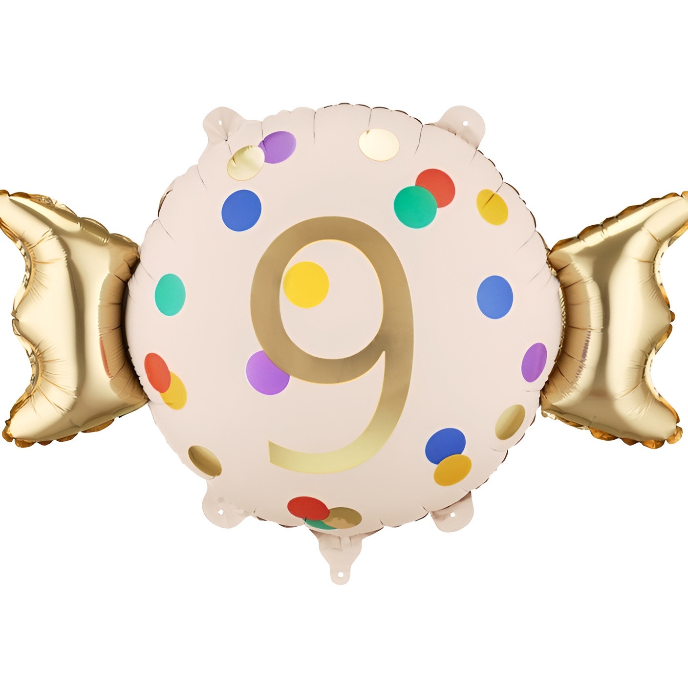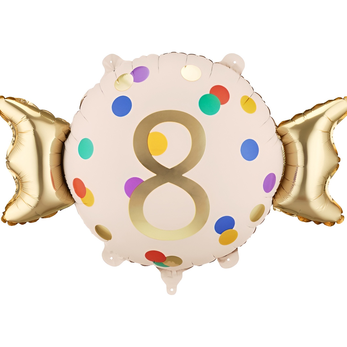 Globo decorativo con el número 1 en elegante combinación beige y dorado. Presenta un diseño tipo "candy" con lunares de colores que aporta un toque festivo y sofisticado. Tamaño aproximado antes de inflar: 76.5 x 48 cm; tamaño tras inflar: 61 x 37 cm. Apto para inflado con aire y helio y pensado para crear un punto focal en la celebración. Ideal para primer cumpleaños, sesiones de fotos y para decorar mesas dulces o rincones especiales.