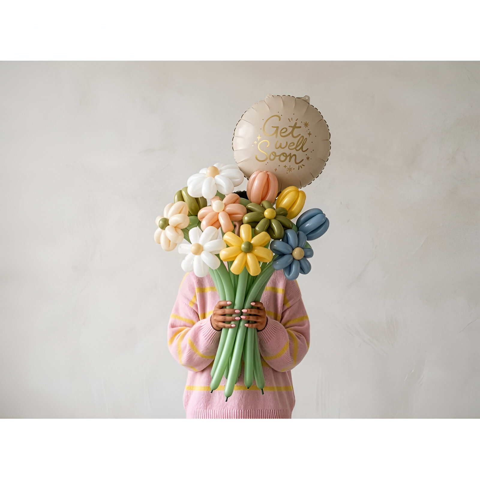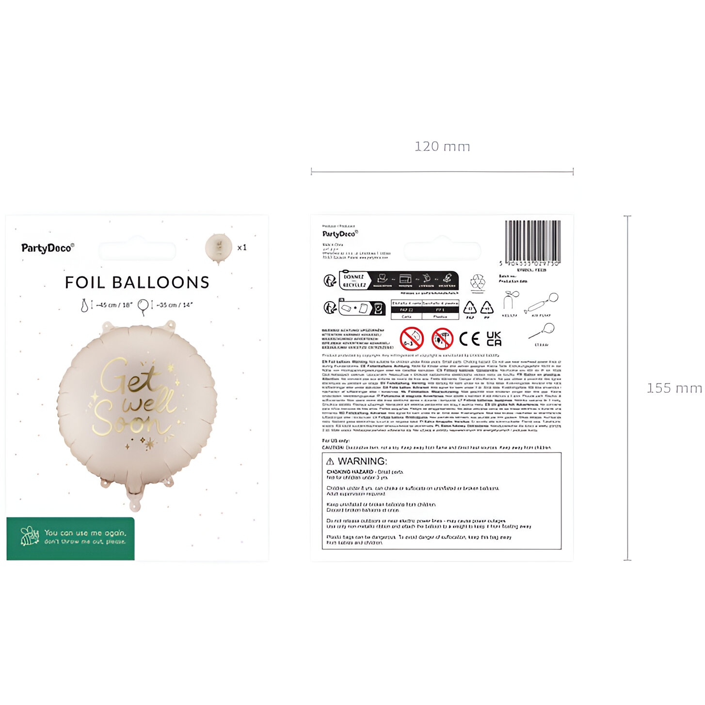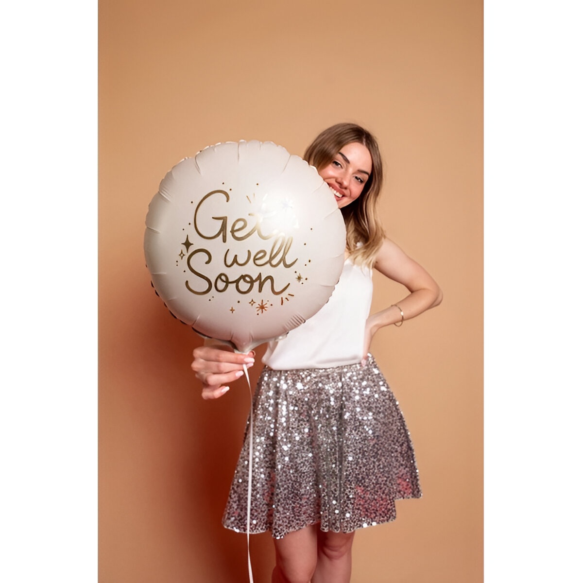 Globo foil redondo con la inscripción reconfortante "Get Well Soon" en un elegante dorado sobre un fondo beige. Diseñado como detalle para visitas y regalos de recuperación, aporta un toque sofisticado y amable. Se infla con aire o helio y mantiene su forma gracias al material foil. Tamaño aproximado tras inflado: 35 x 35 cm.