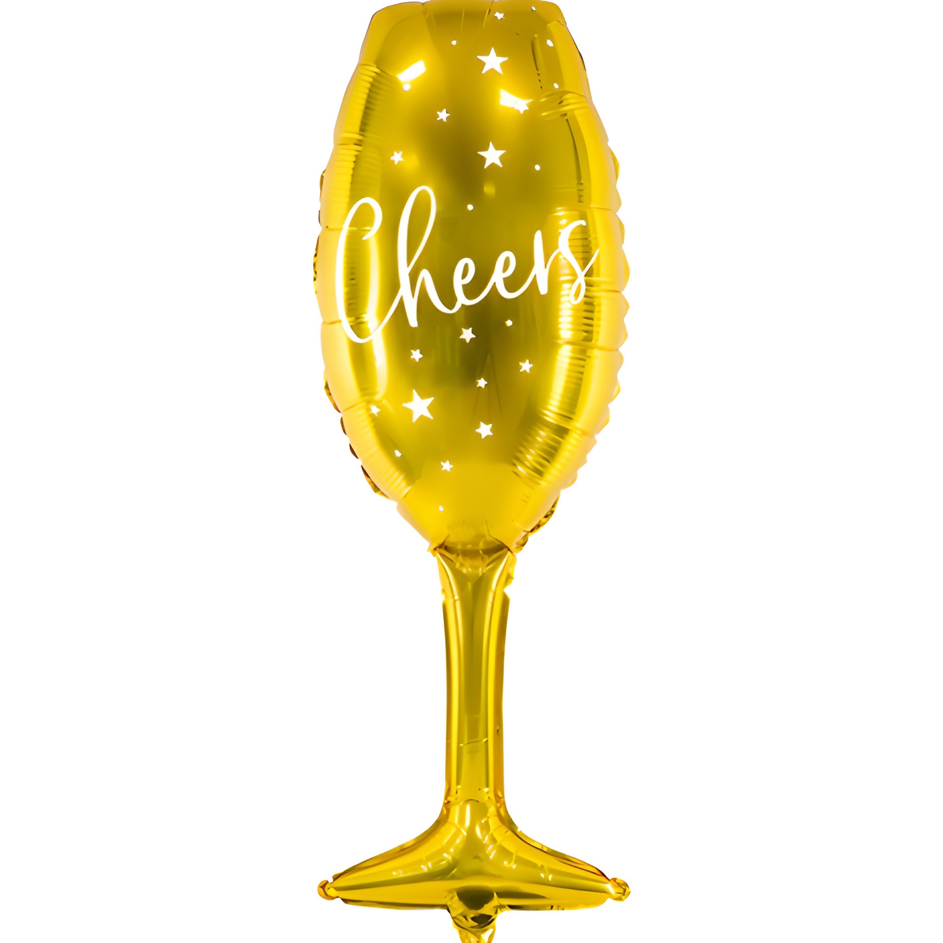 Fabricado en papel foil, este globo XL se caracteriza por su forma de copa en color dorado, con el rótulo ‘Salud’ en inglés y una nube de estrellas blancas de fondo. Puede ser inflado con aire, si bien recomendamos el helio, ya que le permitirá mantener su posición natural.