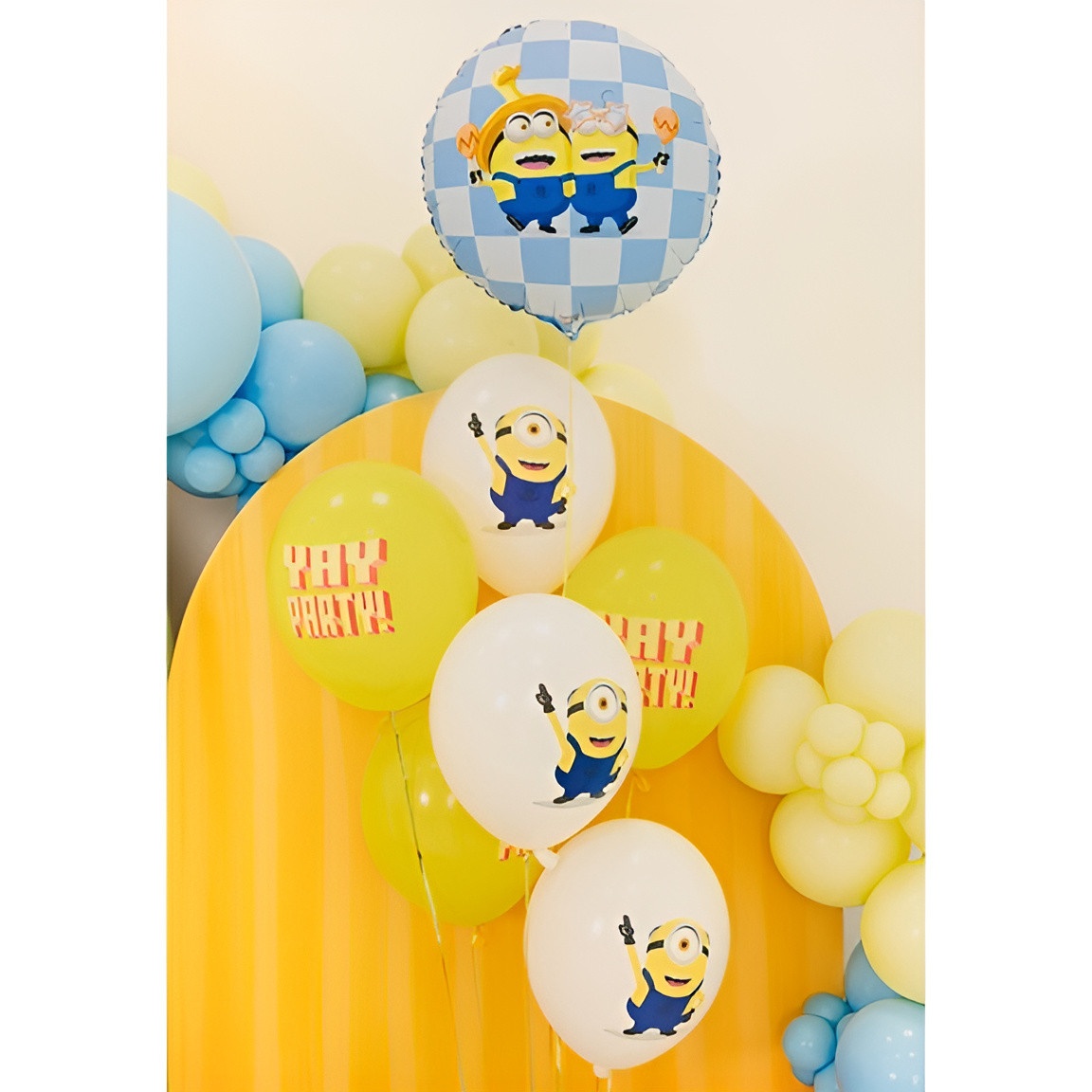Strong Balloons Minions son globos impresos a doble cara con los populares personajes Minions y el mensaje "Yay Party!" en colores pastel. Cada globo tiene un diámetro de 30 cm cuando está inflado, con un diseño alegre en tonos blanco y amarillo miel que aporta diversión a cualquier celebración infantil. Son ideales para decorar cumpleaños, crear centros de mesa y ambientar rincones de fiesta con un toque divertido y reconocible.