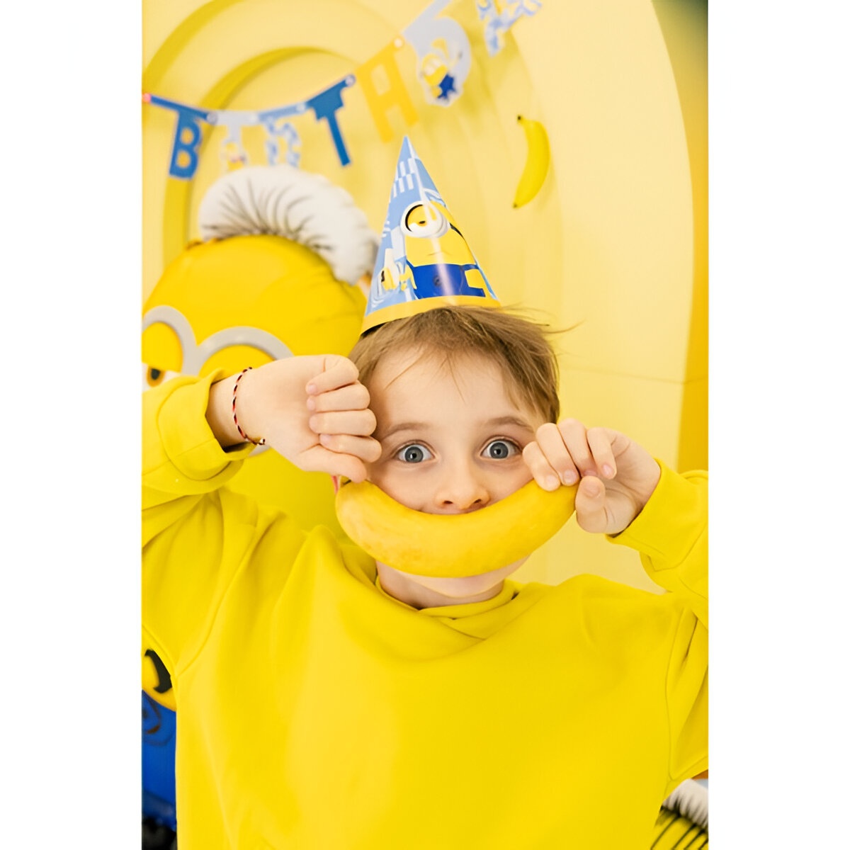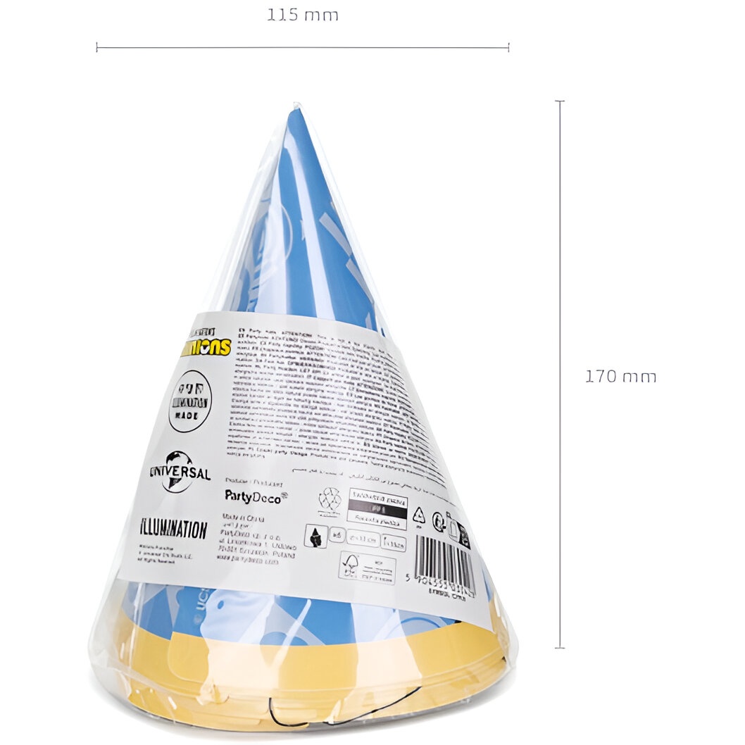 Gorros cónicos oficiales Minions con estampado en tonos azules y los personajes más conocidos. Diseño pensado para los más pequeños: ligero, cómodo y con una silueta clásica que resulta fácil de colocar. Ideales para animar cumpleaños infantiles y sesiones de fotos temáticas. Producto con licencia oficial que aporta un toque divertido y reconocible a cualquier celebración.