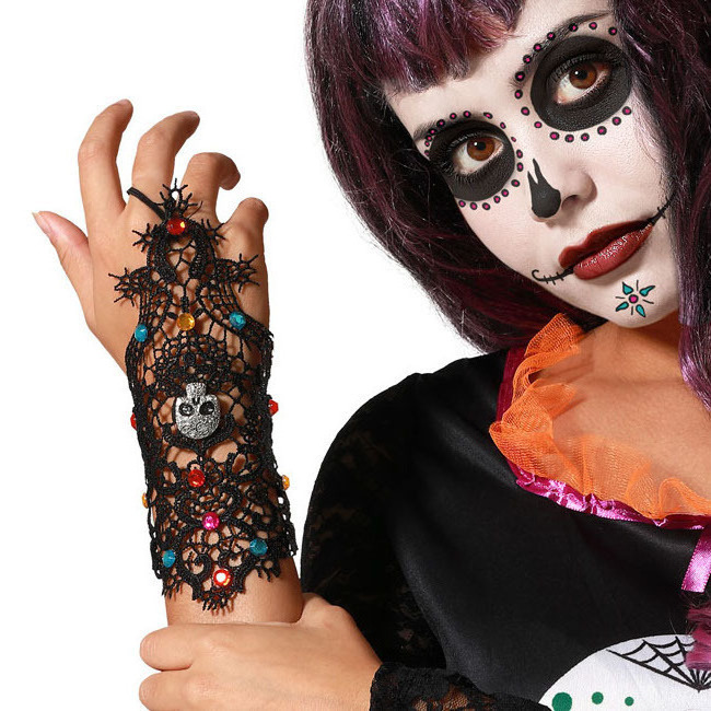 • Guante de rejilla negro con calavera metálica y pedrería multicolor. Ideal para disfraces de Catrina o muerte mexicana.
