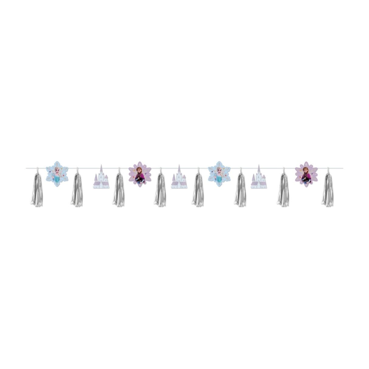 Guirnalda temática de Frozen con las icónicas Elsa y Anna, diseñada para crear un ambiente alegre y mágico en celebraciones infantiles. Combina siluetas en papel con borlas de foil plateado que aportan brillo y movimiento. Su diseño ligero permite una instalación rápida y un resultado vistoso en cualquier zona de la fiesta.