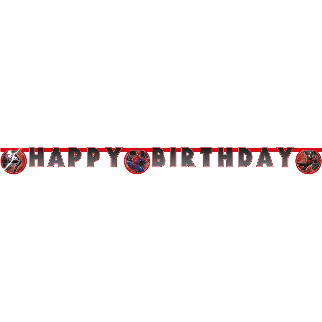 Guirnalda temática Spiderman con letras "HAPPY BDAY" y motivos de telaraña, pensada para dar un toque heroico a las celebraciones infantiles.