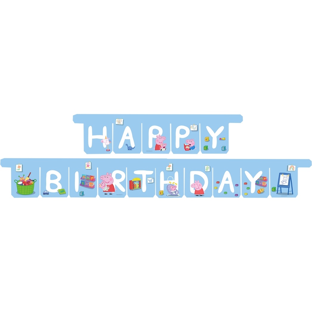 Decora el cumpleaños con la guirnalda Happy Bday de Peppa Pig, pensada para crear un ambiente alegre y divertido. Presenta ilustraciones coloridas de Peppa y sus amigos que atraen a los más pequeños. Los banderines muestran las letras claras para formar el mensaje "HAPPY BIRTHDAY" y se ensamblan de forma sencilla. Ligera y vistosa, es ideal para ambientaciones infantiles y sesiones de fotos de celebración.