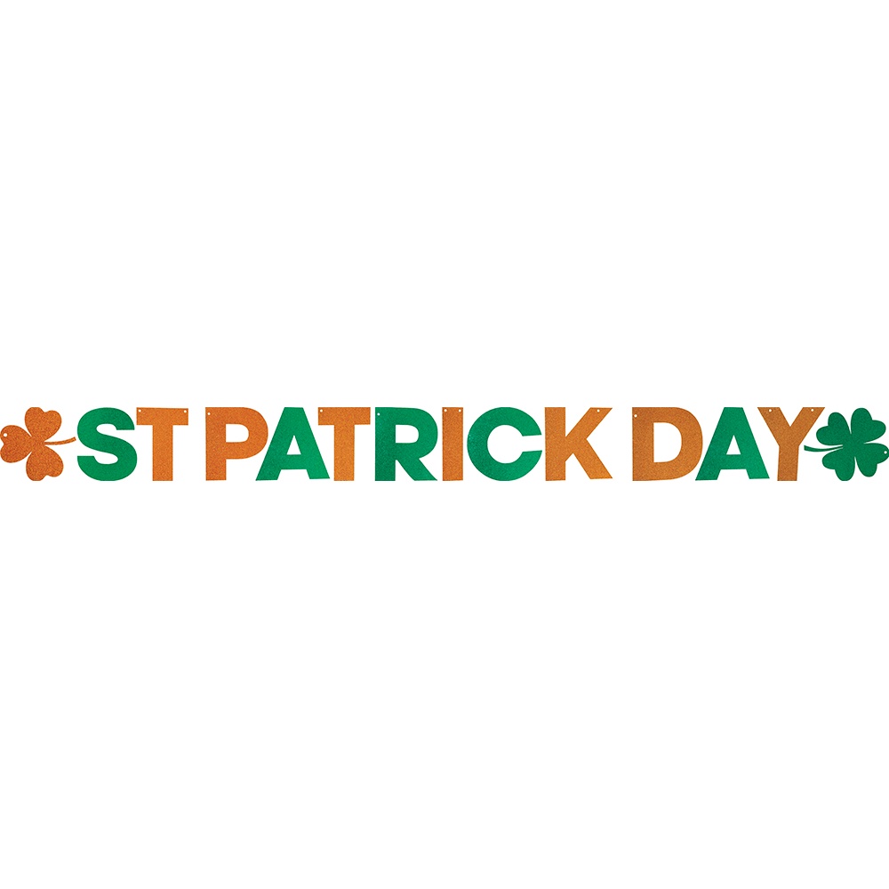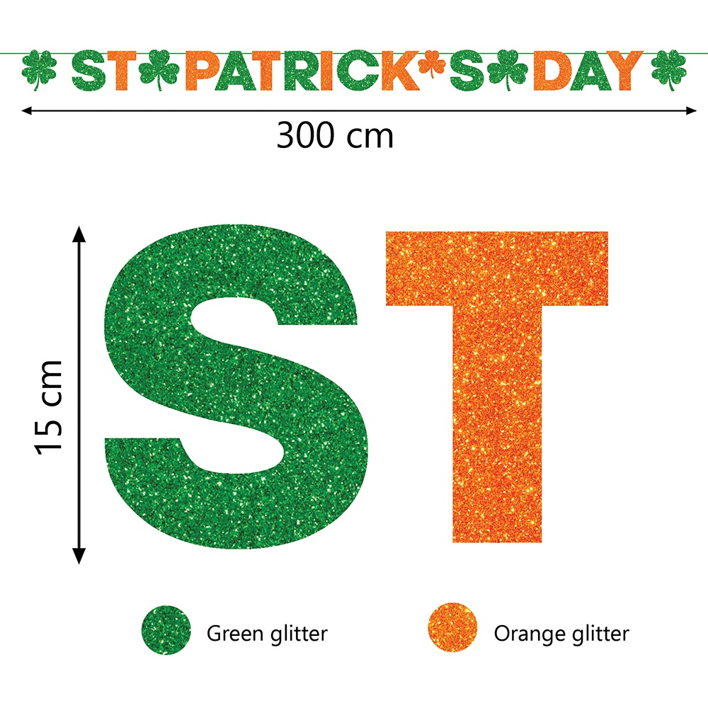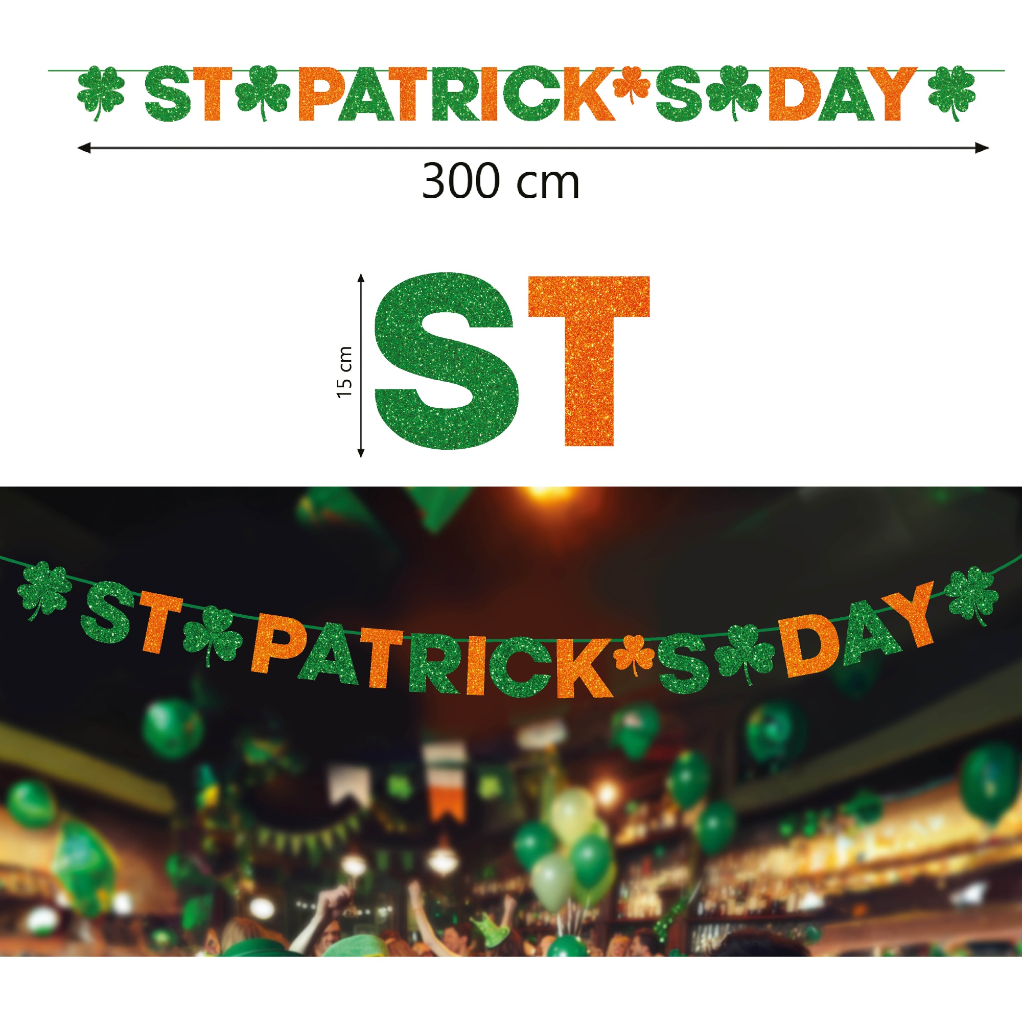 Guirnalda decorativa de 300 cm con temática de San Patrick, formada por letras y tréboles que crean un ambiente festivo y llamativo.
