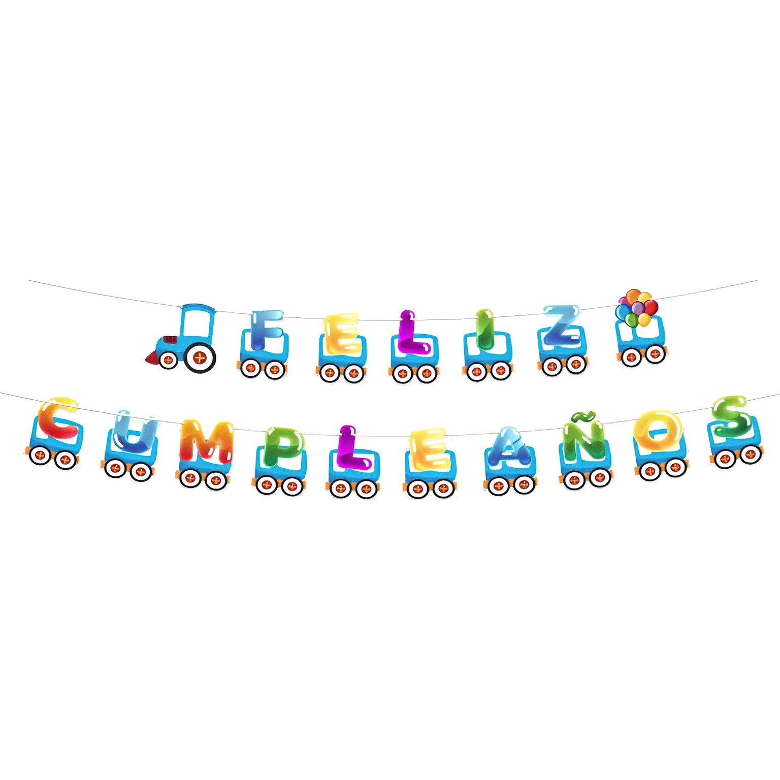 Guirnalda infantil con un encantador diseño de trenecito cuyas letras forman "Feliz Cumpleaños", pensada para celebrar con color y diversión.