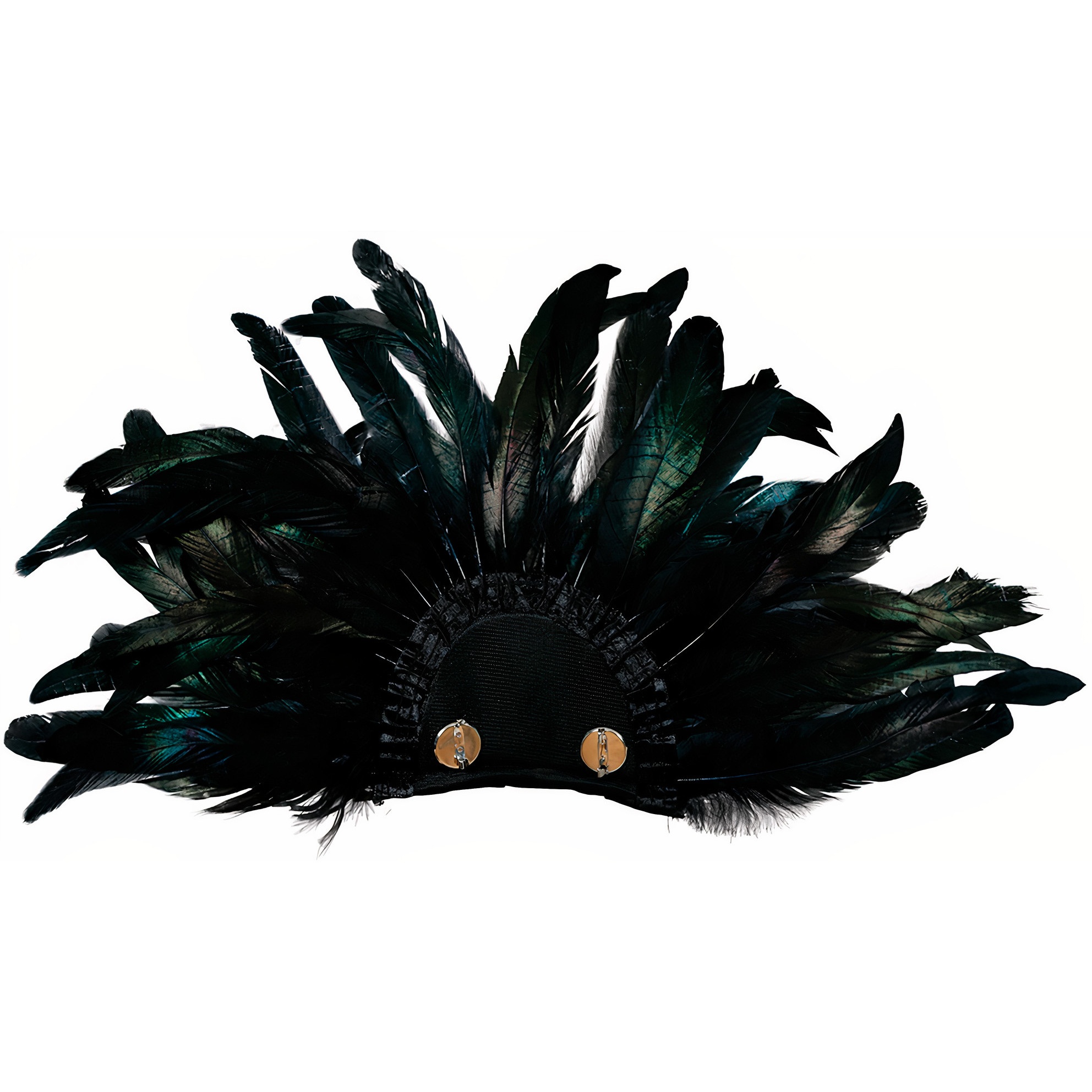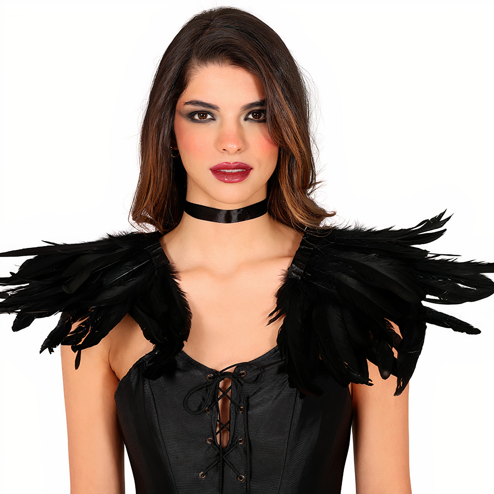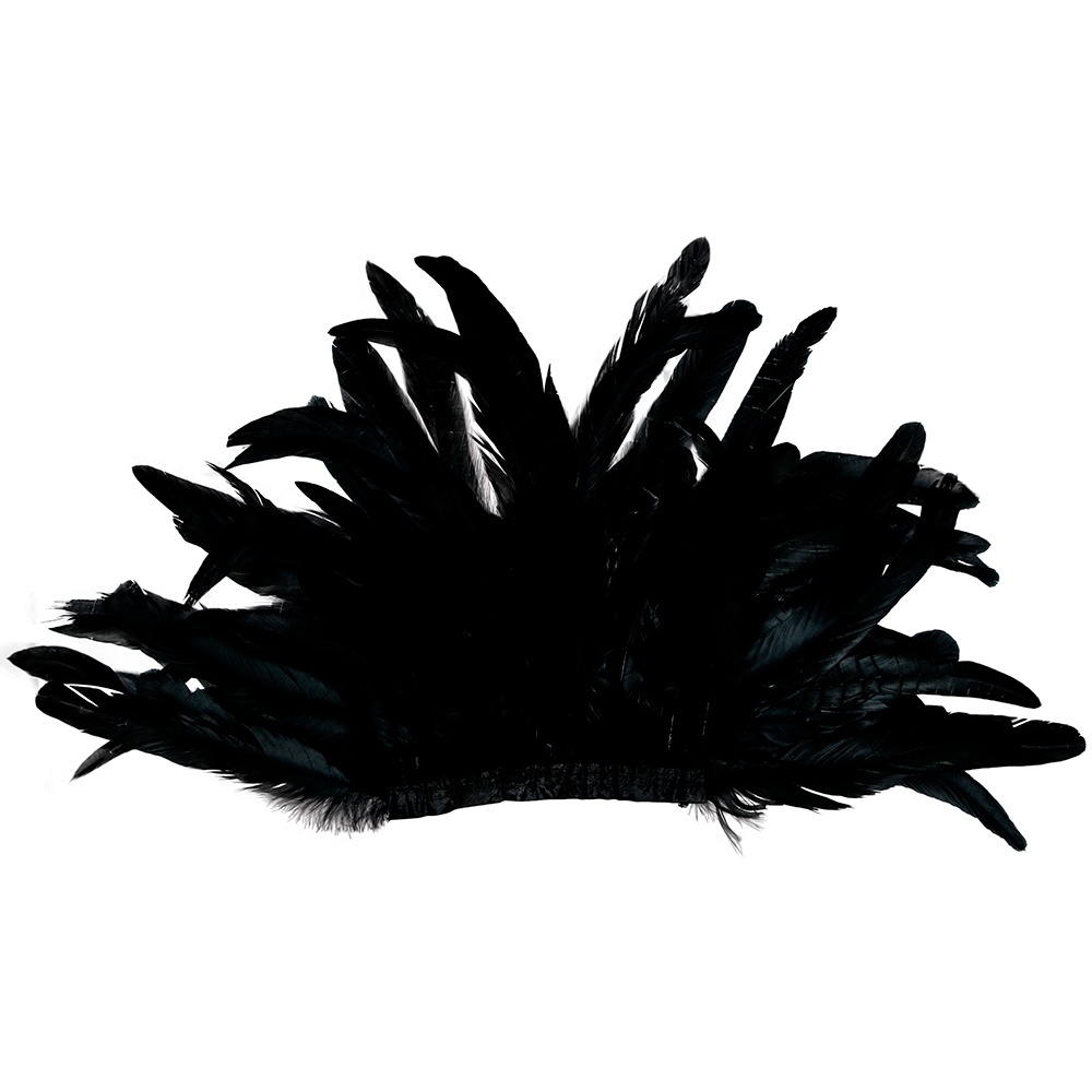 Su acabado en plumas negras crea volumen y un aire escénico que realza cualquier chaqueta, capa o vestuario temático.