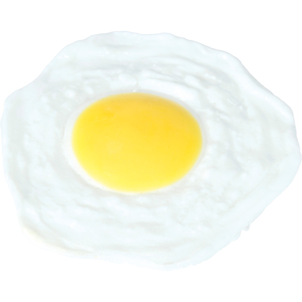 - Material de látex flexible que imita la forma y el tacto de un huevo frito.
