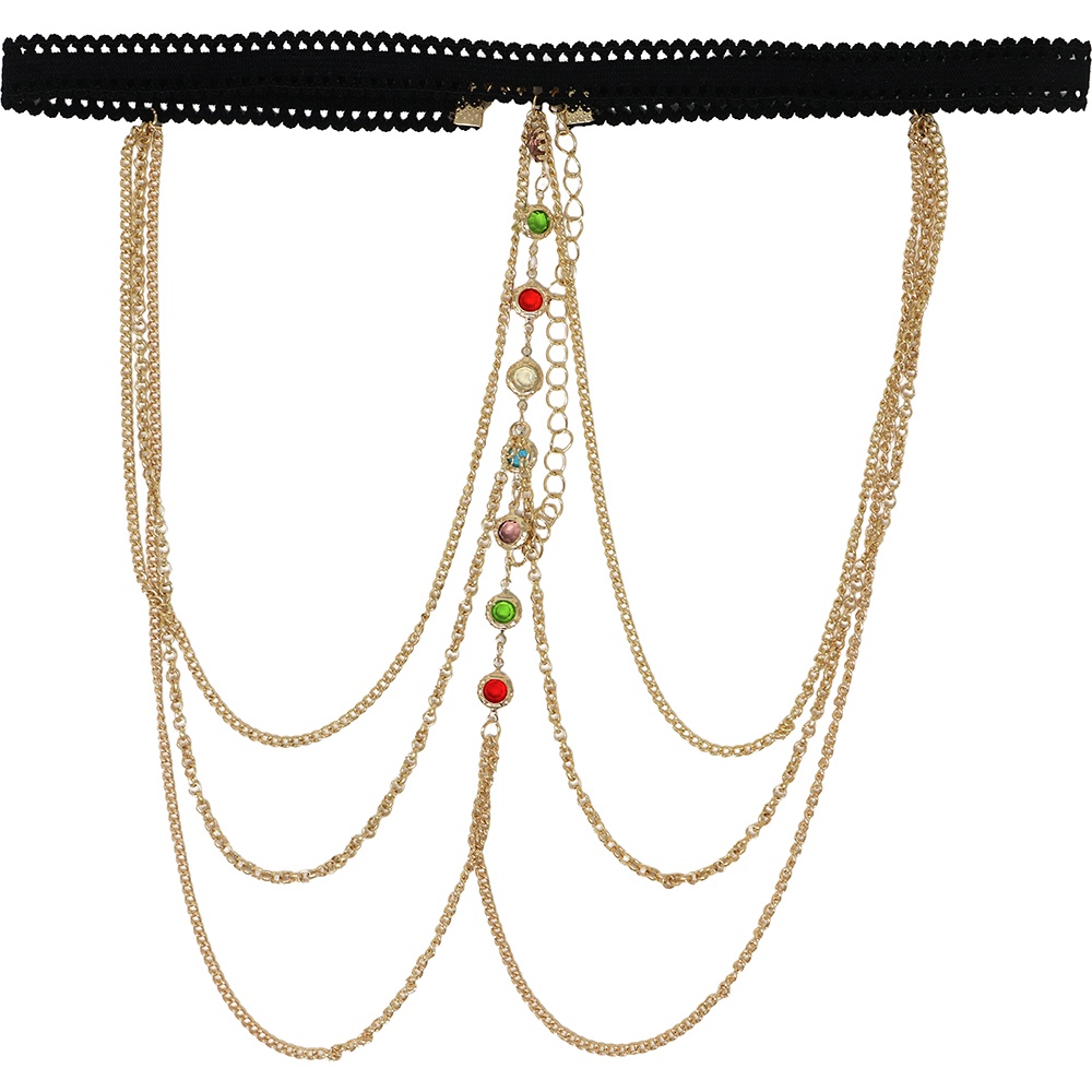 Aporta un toque boho-chic y femenino con cadenas en cascada y piedras de color que aportan movimiento y brillo. Diseño delicado que realza la pierna y complementa vestidos y faldas. Fabricada en metal y PVC con acabado dorado y cuentas en tonos vibrantes. Banda superior pensada para un agarre cómodo y ajuste adaptable.