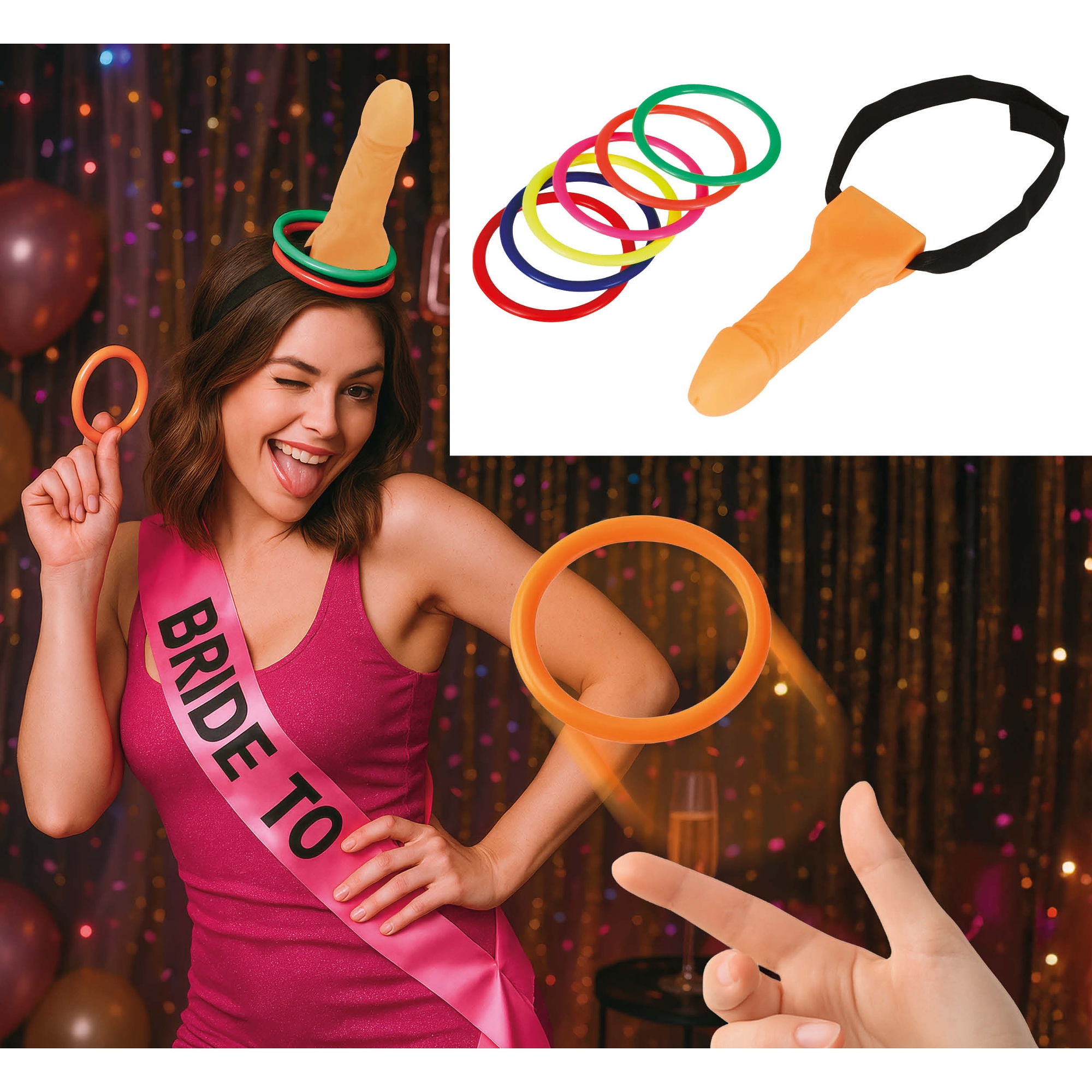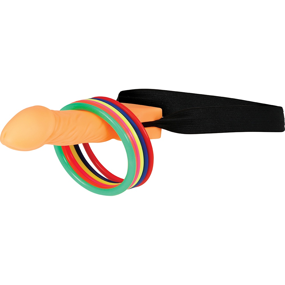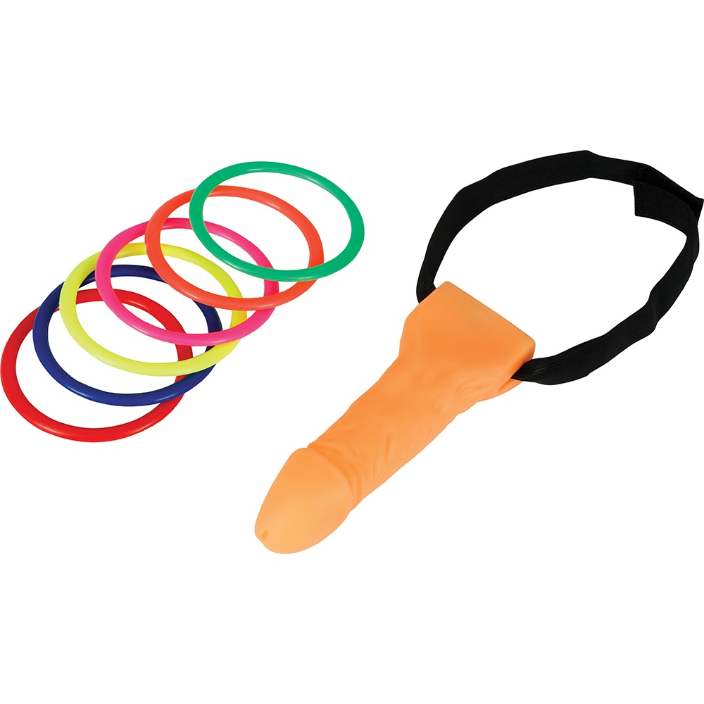 Juego de lanzamiento con diseño picante y divertido. Presenta una figura con forma de pene como objetivo y anillos coloridos para lanzar, pensado para animar reuniones y despedidas adultas.