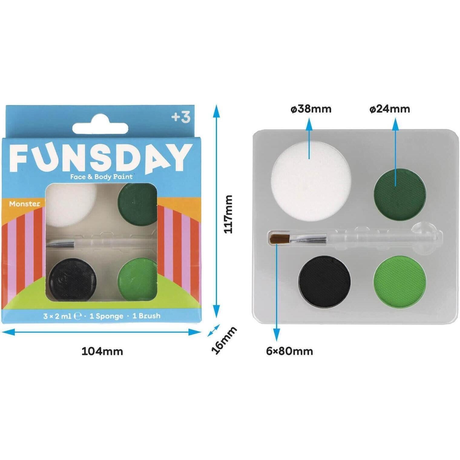 - Kit de 3 pinturas faciales colores de dinosaurio (verde claro, verde oscuro y negro) con pincel y esponja. Fáciles de aplicar con resultados vibrantes y duraderos. Perfecto para caracterización, fiestas, festivales, carnaval o halloween.