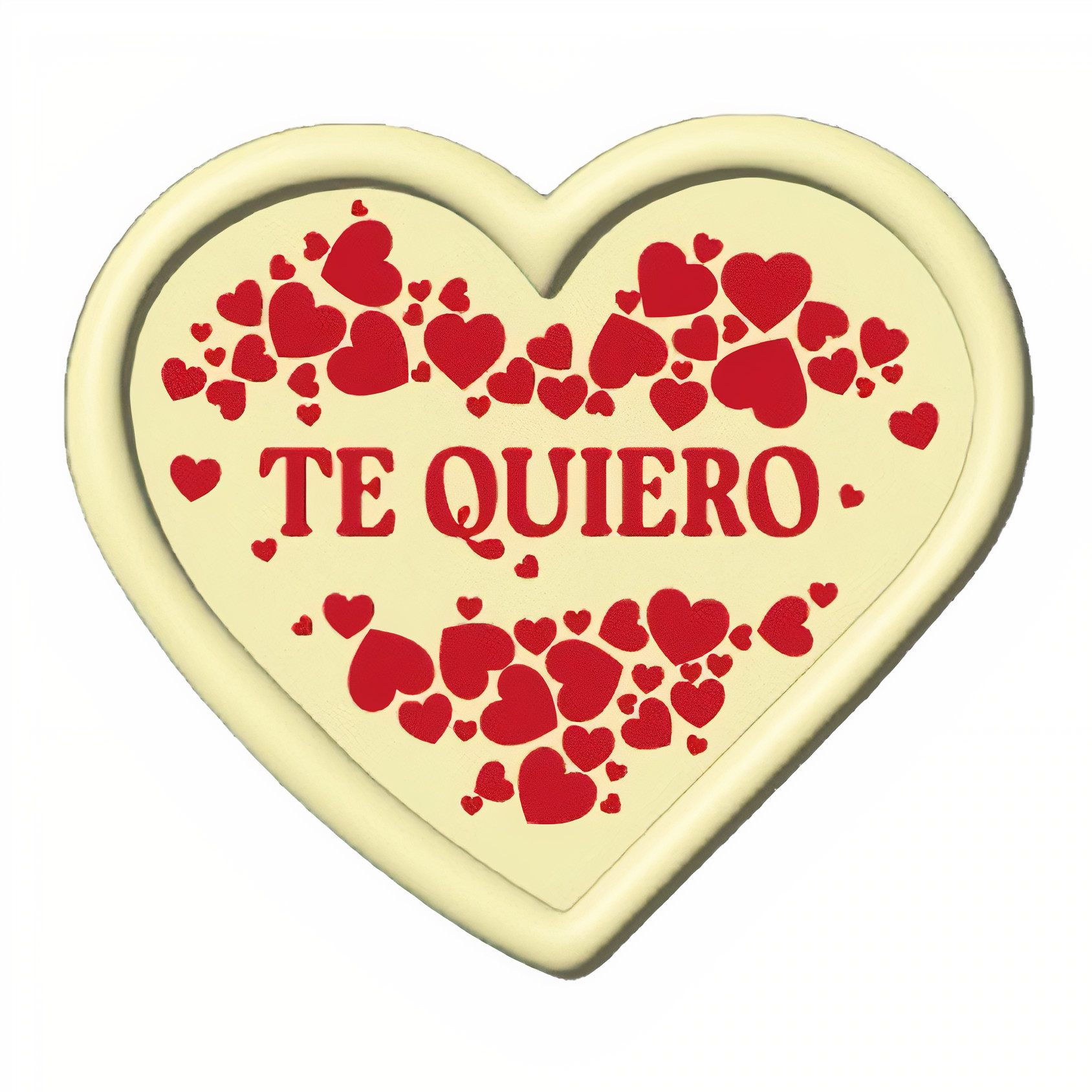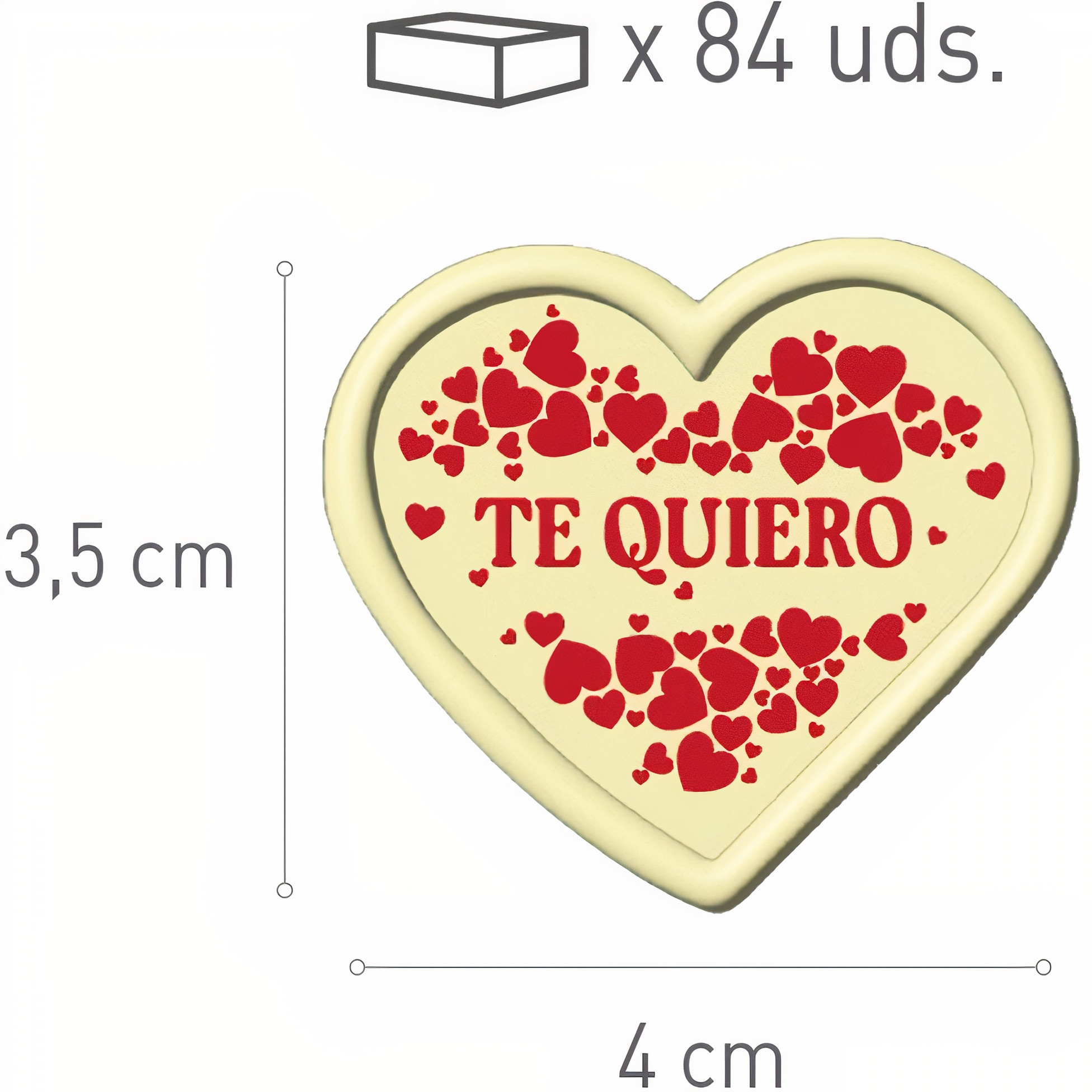 - 84 letreros de chocolate blanco en forma de corazón con mensaje.