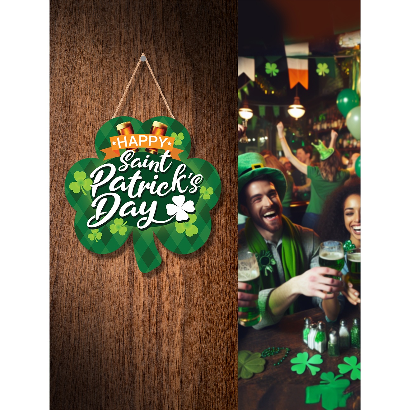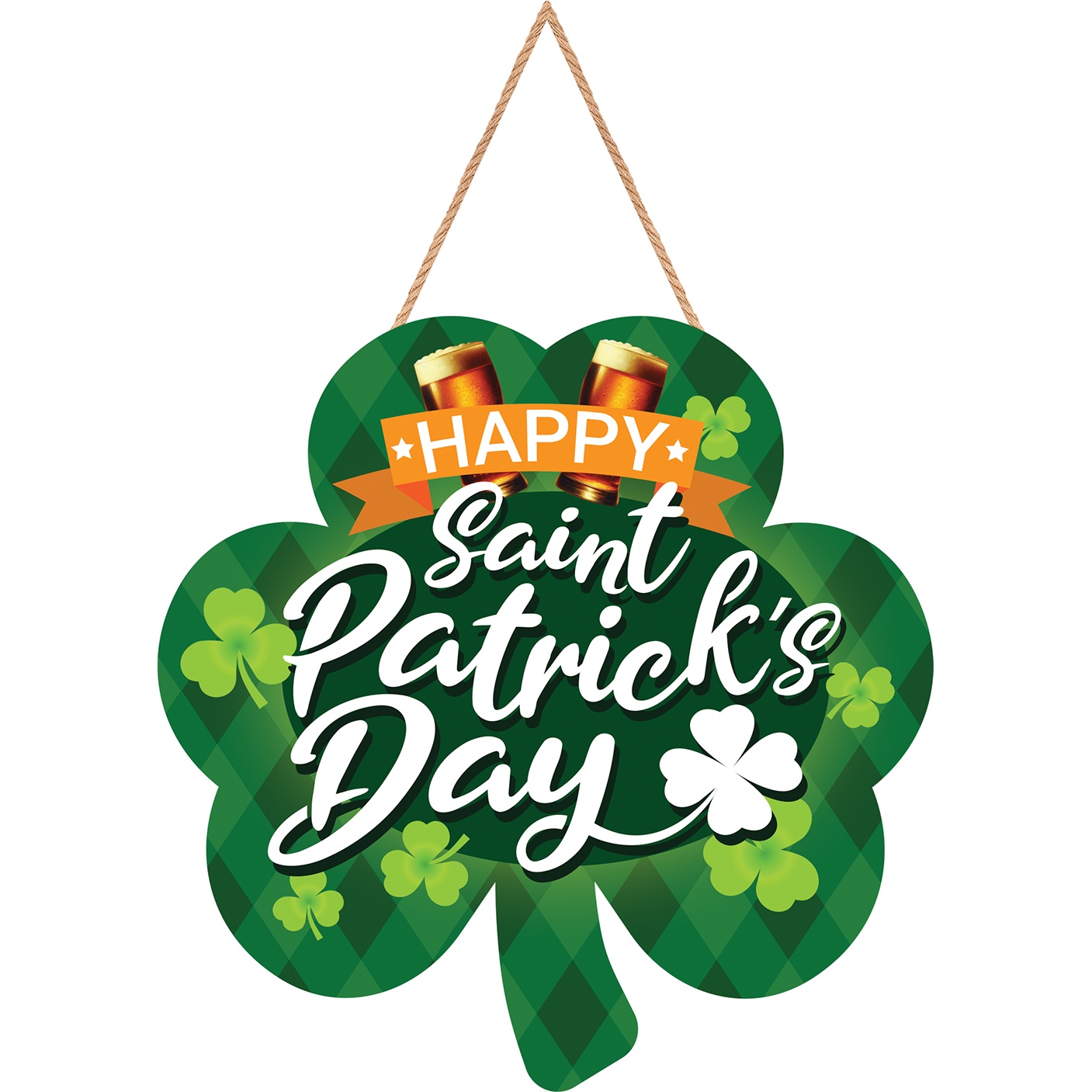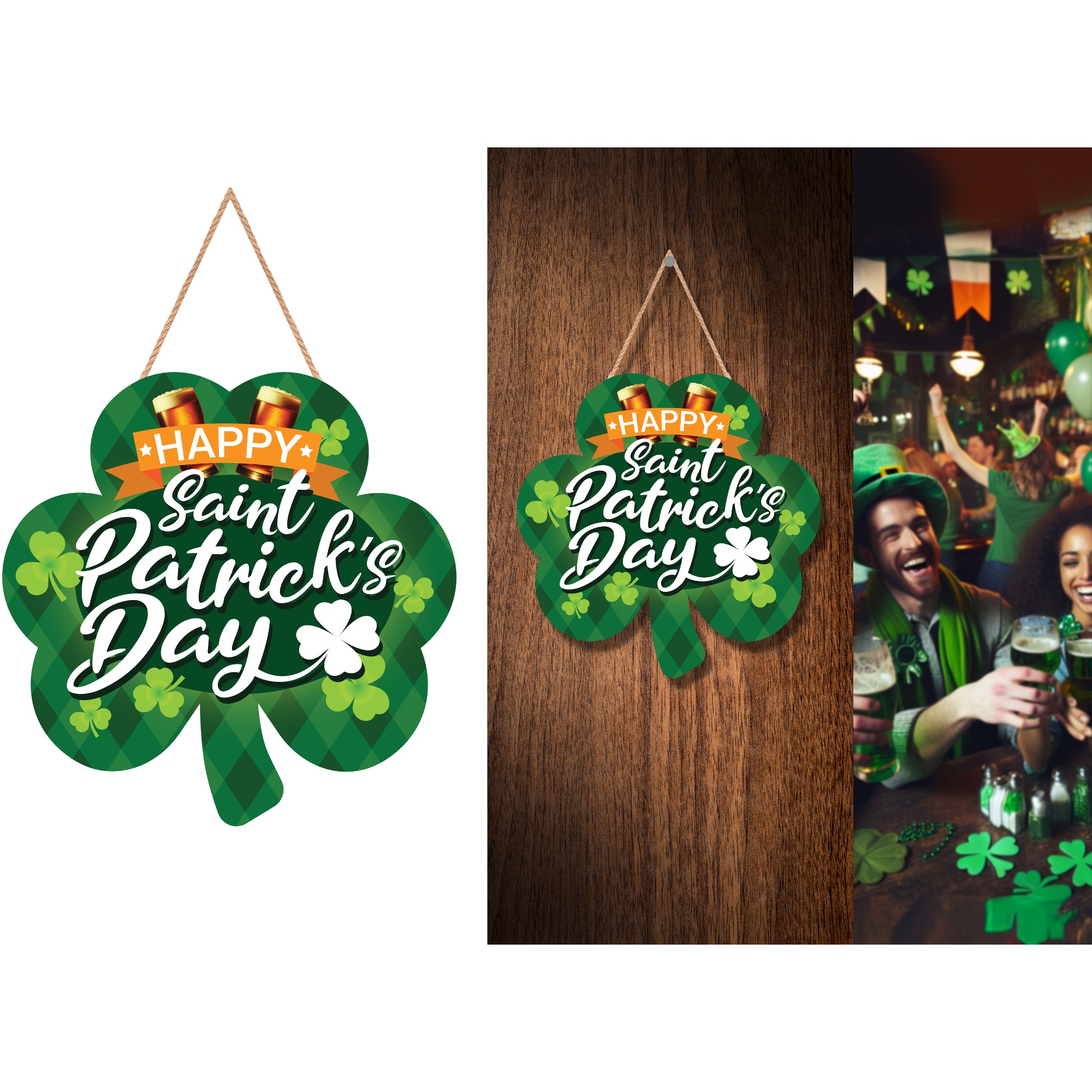 Incluye un detalle de cuerda para colgar y un acabado que realza los verdes tradicionales, ideal para pubs, bares y reuniones de San Patricio.