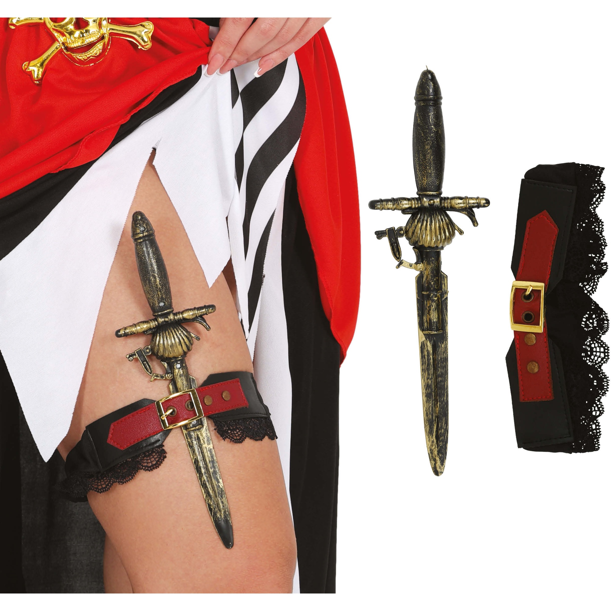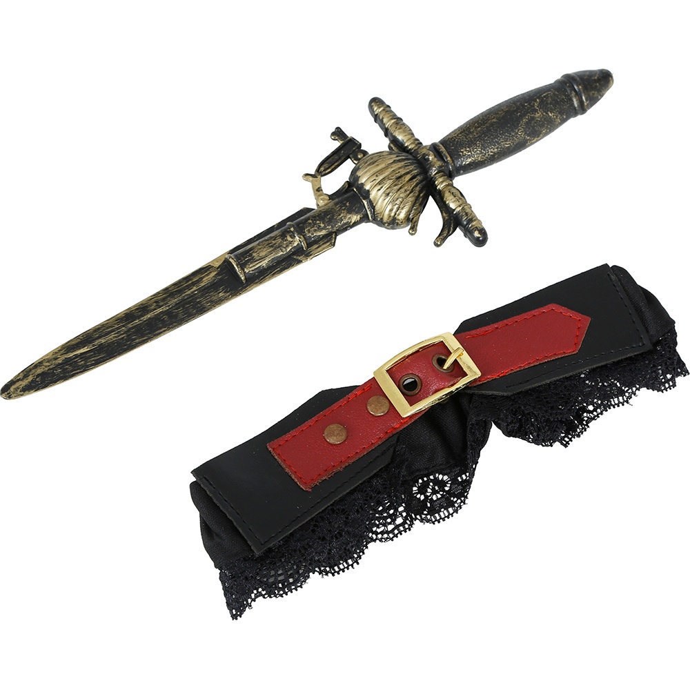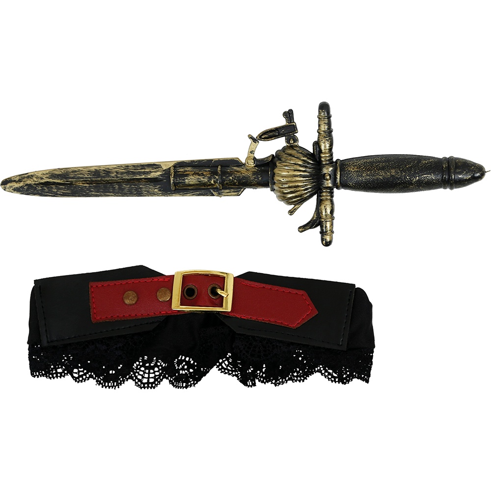Glamorosa liga con daga estilo pirata pensada para adultos. Aporta un toque atrevido y temático a tu disfraz de corsaria o marinera. La daga decorativa con acabado envejecido y la liga con encaje y hebilla crean un accesorio llamativo y realista. Diseño ligero y ajustable que se coloca fácilmente en el muslo para completar tu look de fiesta, Carnaval o sesión fotográfica.
